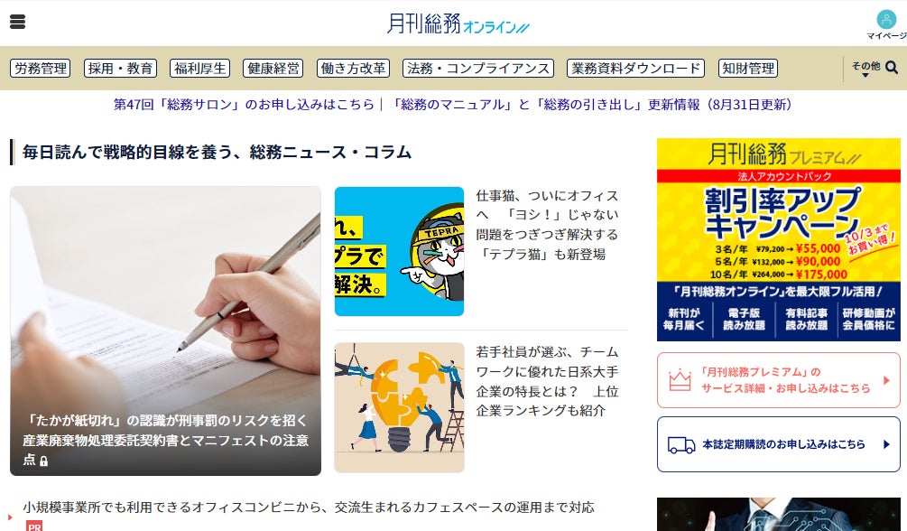 『月刊総務』が毎号届き、「月刊総務オンライン」の有料記事も読み放題になるなど、多様なサービスがお得に利用できる有料の会員制サービスです。最大約30%もの割引きが適用される法人向けの契約プランもあります。