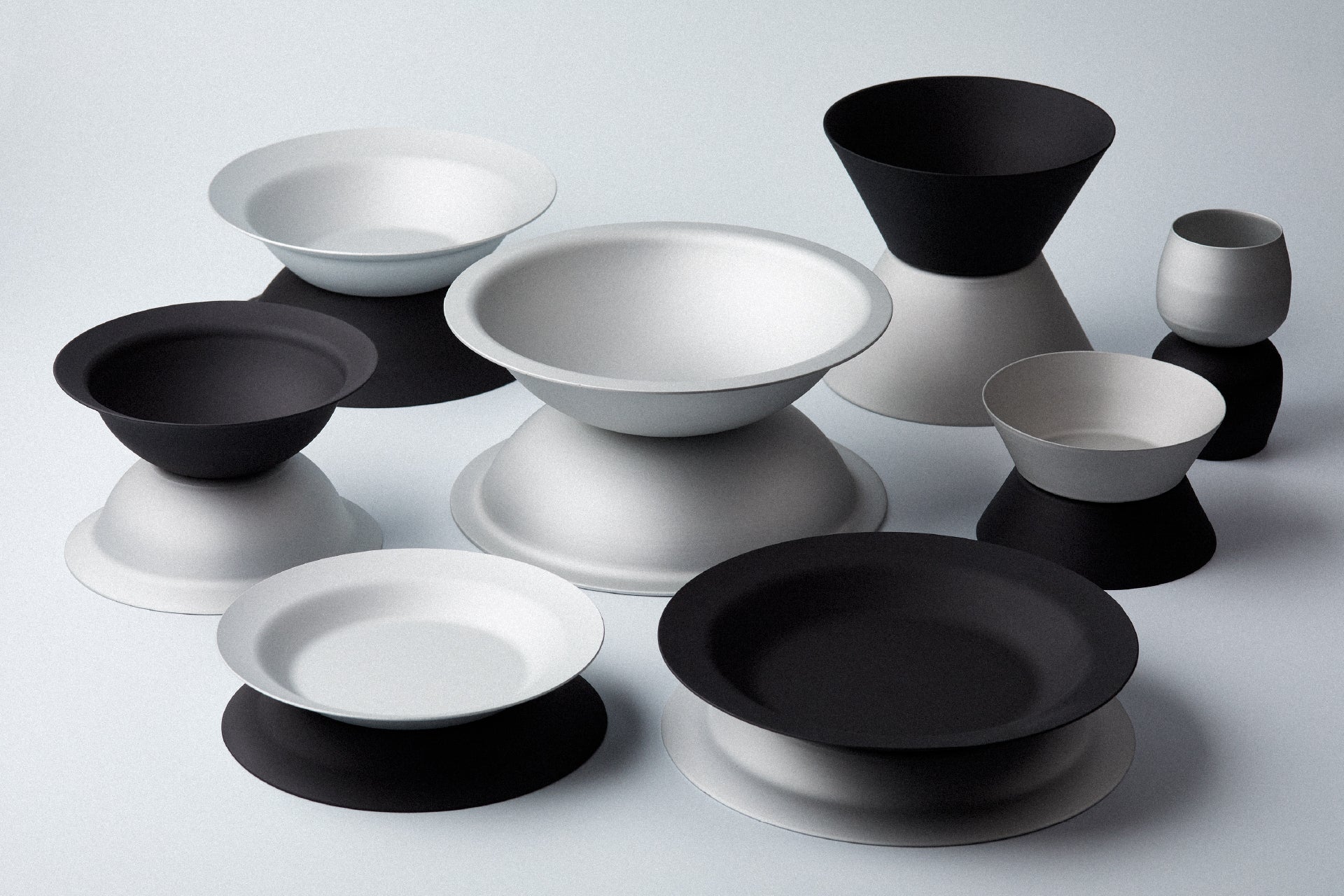直火可能なテーブルウエア「HEGE」は、日東電化工業が創業以来手がけてきた、 自動車や家電部品のものづくりの技術から生まれました。その特徴は、熱伝導性の高いアルミを用いた直火可能な調理器具であり、器にもなるという合理的な機能美にあります。美しい曲面は、手仕事に近い技術を要する “へら絞り”で一枚ずつていねいに成形し、ブラスト加工で洗練された渋みのある質感を表しています。さらに表面は防食しながら表面の強度を高める厚膜アルマイト加工で仕上げ、工業的な技術を用いながらも、使い込むほどに味わいと風合いが増す工芸品の側面も持ち合わせます。
