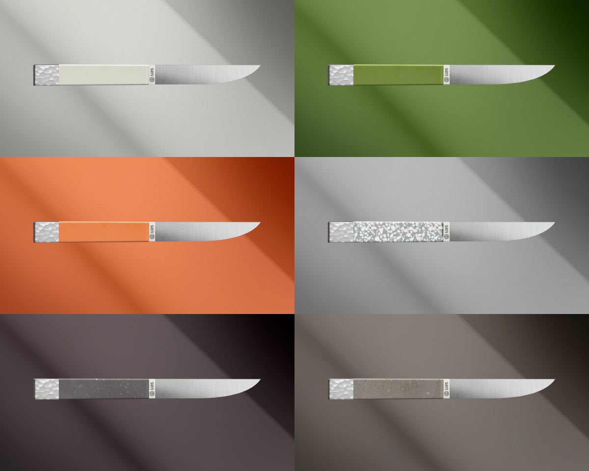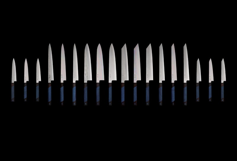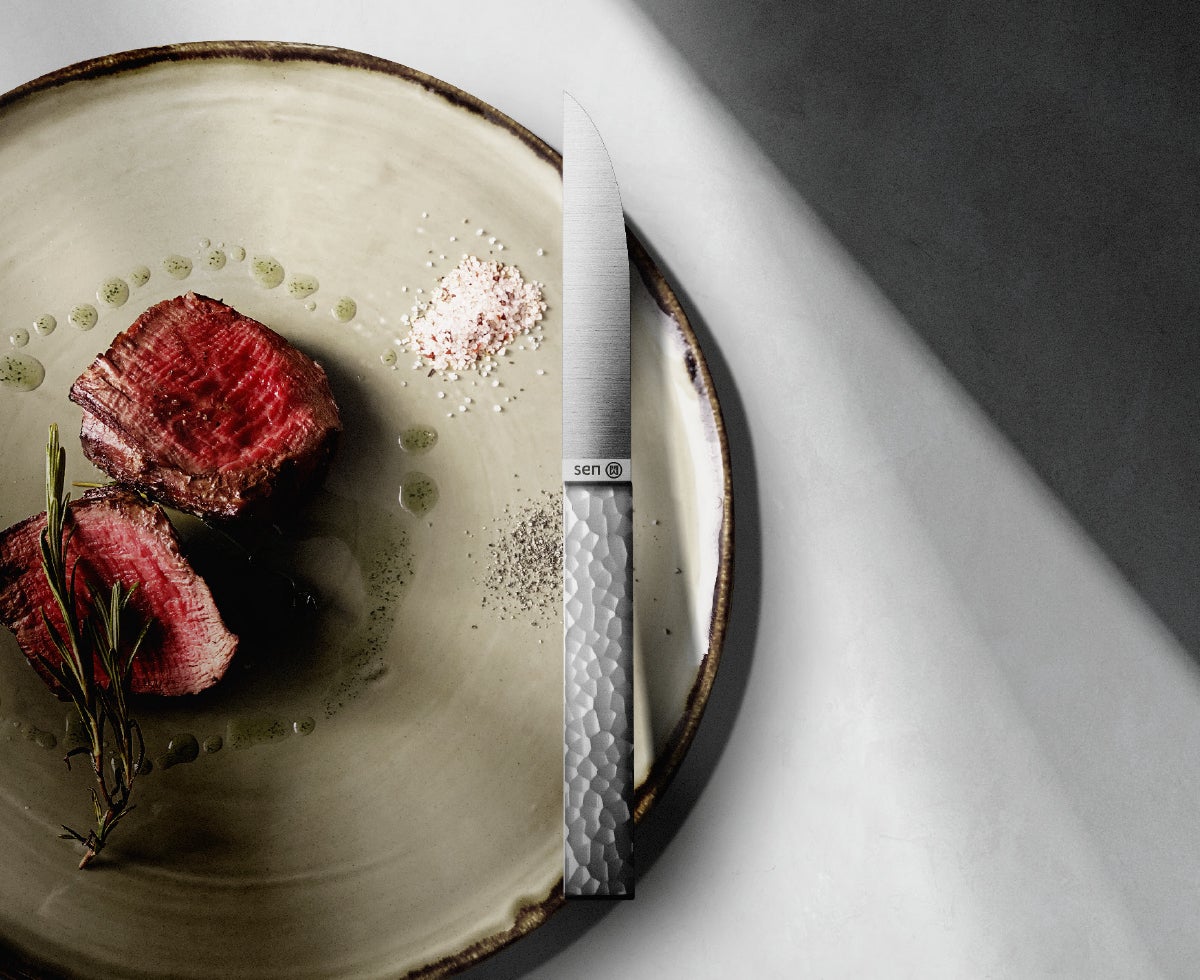 日本の一流シェフが愛する堺打刃物の材料を作っている日立金属が製造しているステンレス鋼 銀紙三号を使用。日立金属が製造する刃物鋼は不純物が少なく、取り扱いが難しいが、商品になった際には、炭素鋼に近い切れ味を生み出します。sen閃は、日本伝統の文化や歴史を世界に広げていくブランドで、ハンドルは、畑から管理し、また、完全無農薬の持続可能な農法を追求し、サステナブルな未来を志向する藍染を採用。木目の美しさを見事に浮きあがらせ、藍でしか表現できない風合いを醸し出す、一点一点異なる木目模様を実現しました。