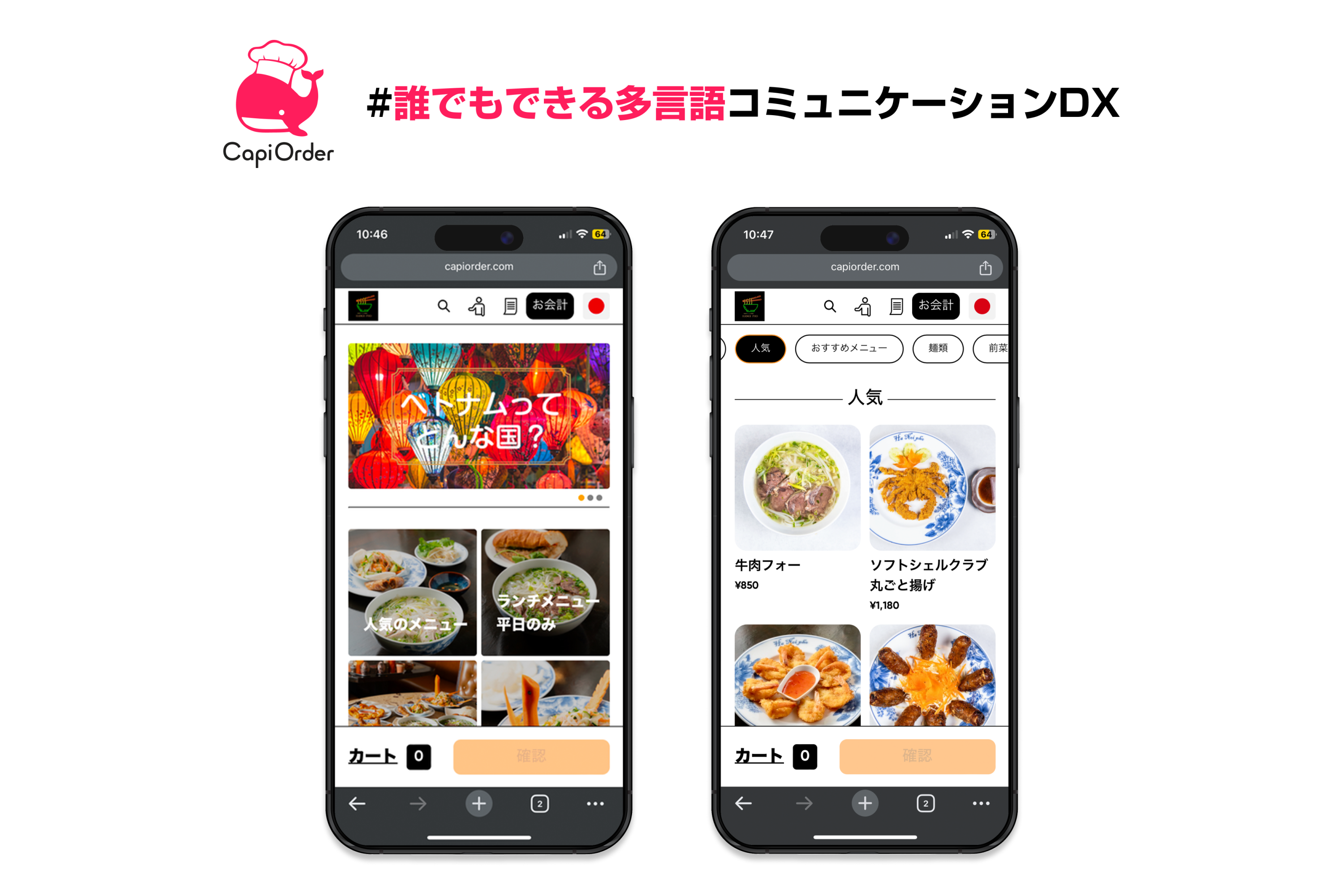 Capi Orderは、ベトナム、タイ、日本などの合計200店舗以上で利用されている多言語モバイルオーダーシステムです。