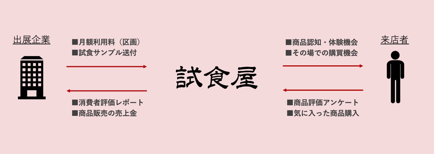 試食専門店 試食屋とは、全国各地から集めた「味とこだわり」に自信を持つ食品/飲料の商品を、店舗で無料で好きなだけ試せる体験型ショールーミングストアです。試食屋では、全ての商品をその場で試すことができ、気に入ったものがあれば『その場で購入もしくはEC紹介』をすることで、新しい商品との出会いや、満足度の高い消費者の購買活動を実現しています。