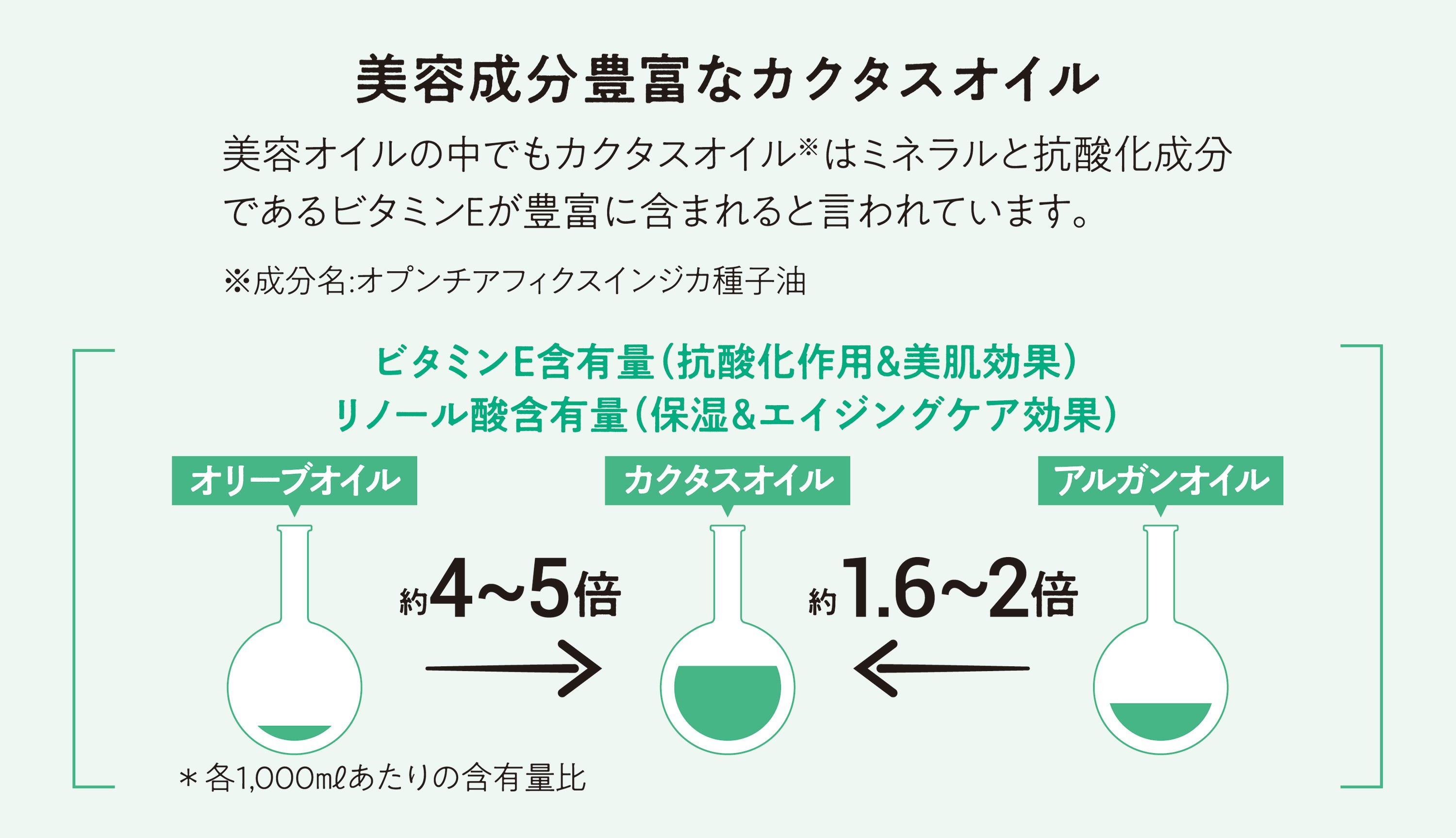 1トンのウチワサボテンから1リットルしか抽出できない奇跡のオイル。サハラ砂漠を有するチュニジアの過酷な環境下で育ったウチワサボテンの種子から一年に一度だけ抽出されたオイルを使用。約60時間、複数の工程に分け丁寧にリファイニング(精製)を行い、ウチワサボテンの持つ豊富な栄養成分はそのままに目に見えない不純物やクセのある臭気だけを取り除いた純度の高い美容オイルです。