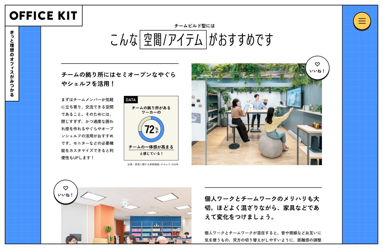 「OFFICE KIT」は、新しいオフィスをつくりたい企業が企画段階で自分たちにふさわしい働き方やオフィス空間の検討をサポートするツールです。ウェブサイト上で実現したいことや理想のオフィスを選択していくと、最適なオフィススタイルを診断し、働き方や空間、アイテムの活用例を紹介します。また、オフィスの人数規模などの入力により、モデルレイアウトやポイント解説、コストやオフィス構築期間の目安などの情報を提供します。