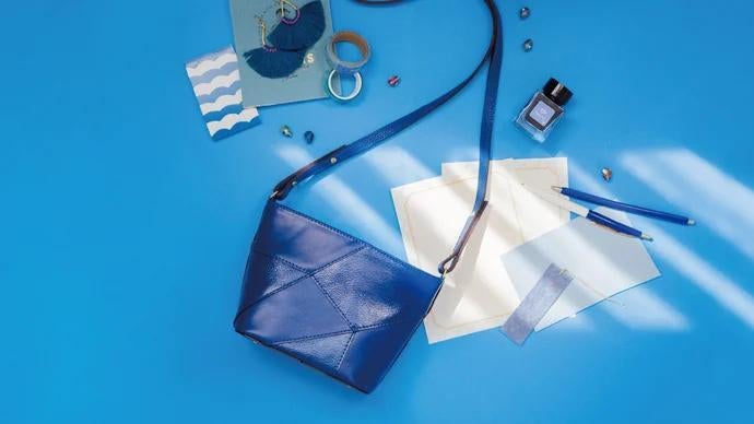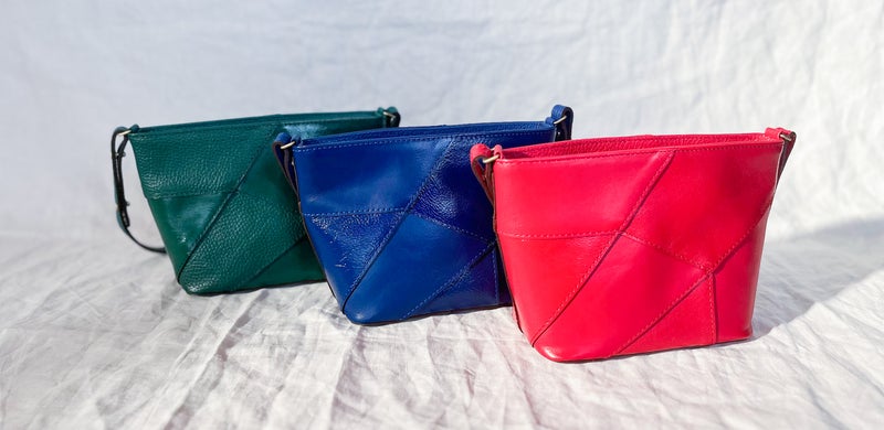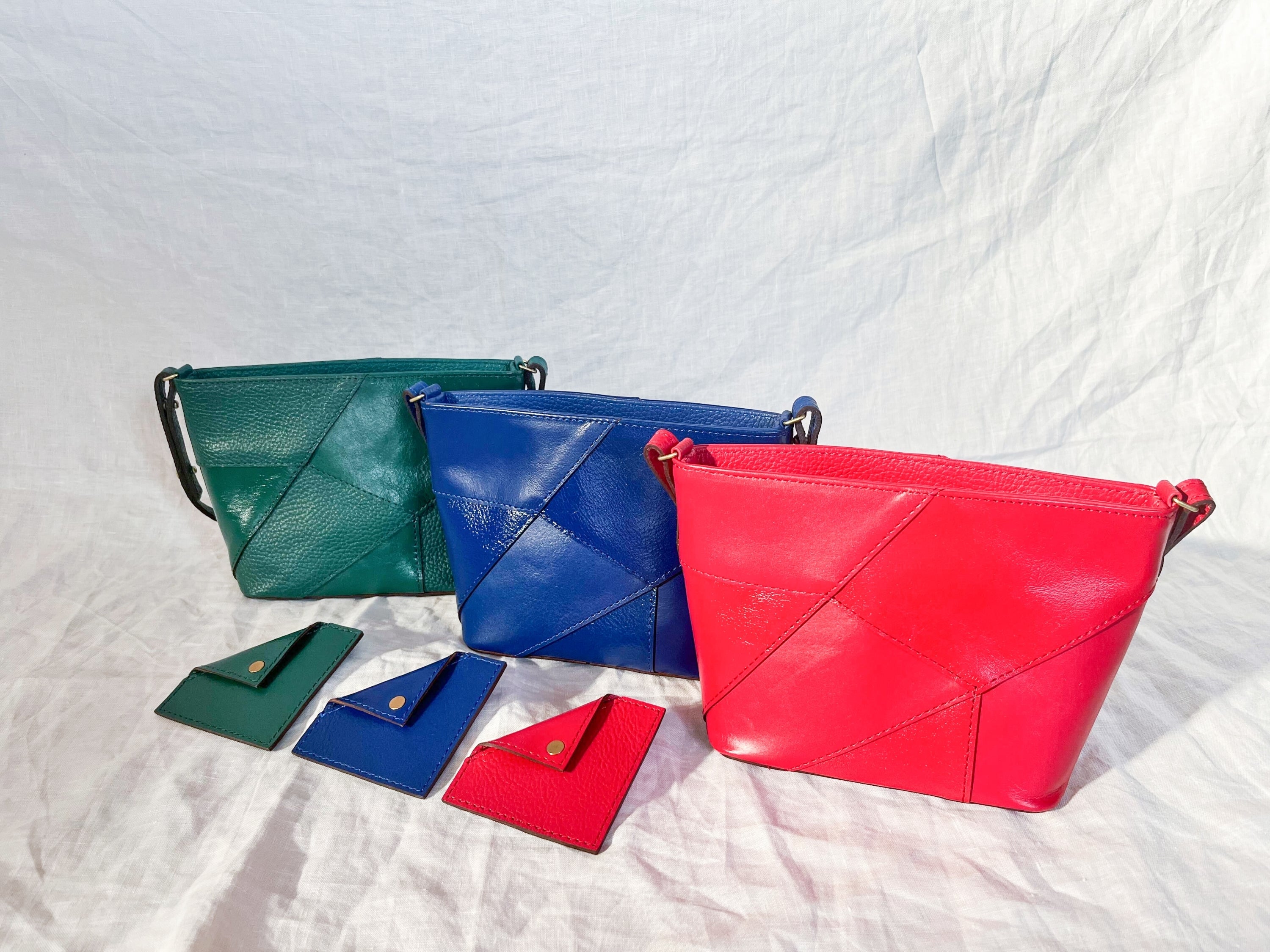 香川県・東かがわ市の縫製工場から出る上質な未利用革(革の端材)を使用し、職人の手作業により宝石の代表的なカットの一つ「エメラルドカット」で繋ぎ合わせ、兵庫県たつの市の老舗工場でリカラーを施したミニバッグ。ルビー(赤)・サファイア(青)・エメラルド(緑)の3色。今後は誕生石カラーで展開予定。