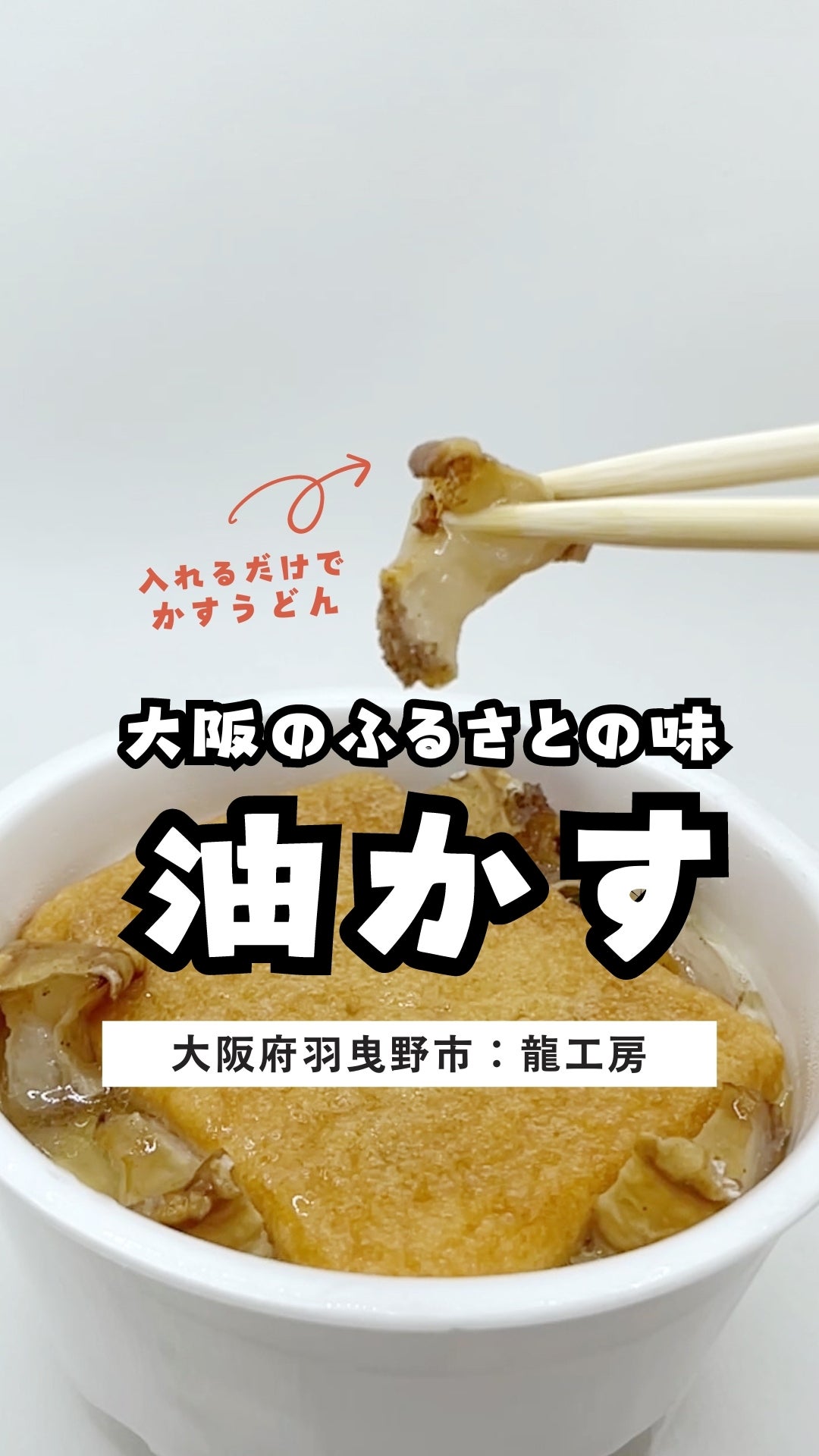 牛の小腸を油で揚げて余分な脂や水分を飛ばした食品で、表面はカリカリで中はプルプルとした食感があり、コクのある独特のうまみがあります。大阪の南河内地域で昔から食べられており、かすうどん等に使われています。