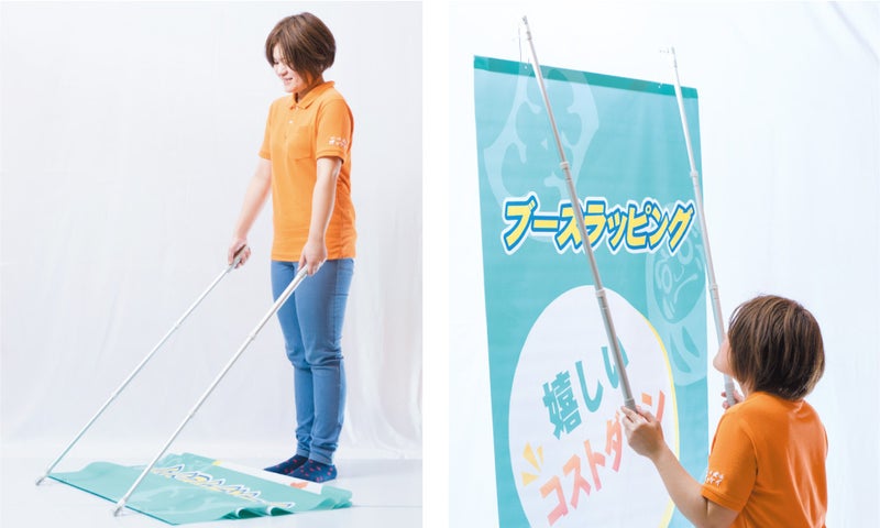 ブースラッピングは、フルカラー印刷したクロス(布)をひっかけるだけで簡単に取り付けできるブース装飾です。