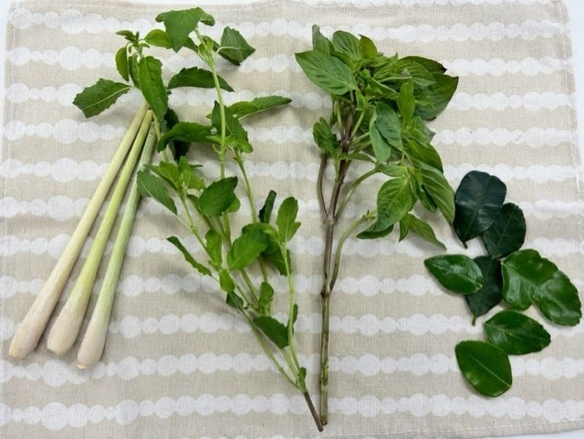 ●具材は鶏肉、スズメナス、ヤングコーン、プリッキーヌ、ホーリーバジル、こぶみかんの葉、タイショウガ(ガチャイ)を使用しています。