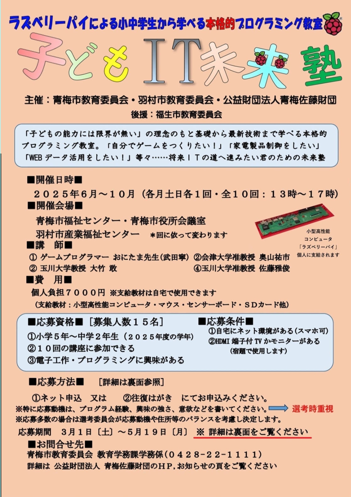 ラズベリーパイを使った本格的なソフトウェア・ハードウェアプログラミング教室「子どもIT未来塾」が、今年もスタートしました。 2018年に開講して以来、今年で第7回目の開催となります。