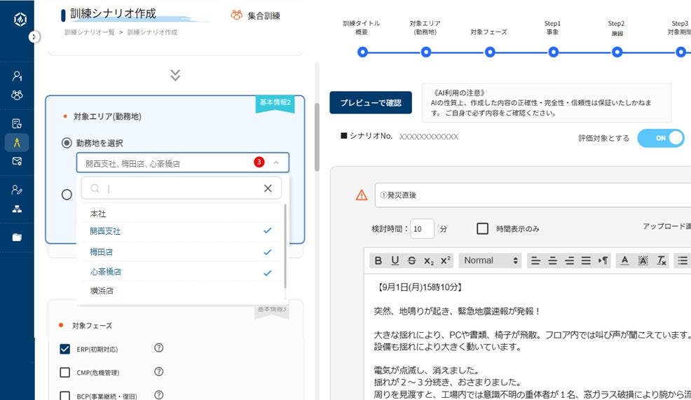 自然災害やサイバー攻撃など、さまざまな訓練シナリオが作成できます。