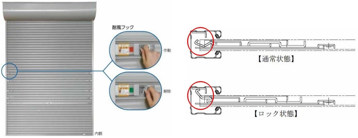 シャッターカーテン両端中央部に設置された可動式耐風フックを作動させることで耐風圧性能800Paを確保します。さらに、防火設備の設置が義務付けられた開口部にも対応できるため、店舗・倉庫の出入口や住宅用ガレージなどに最適です。