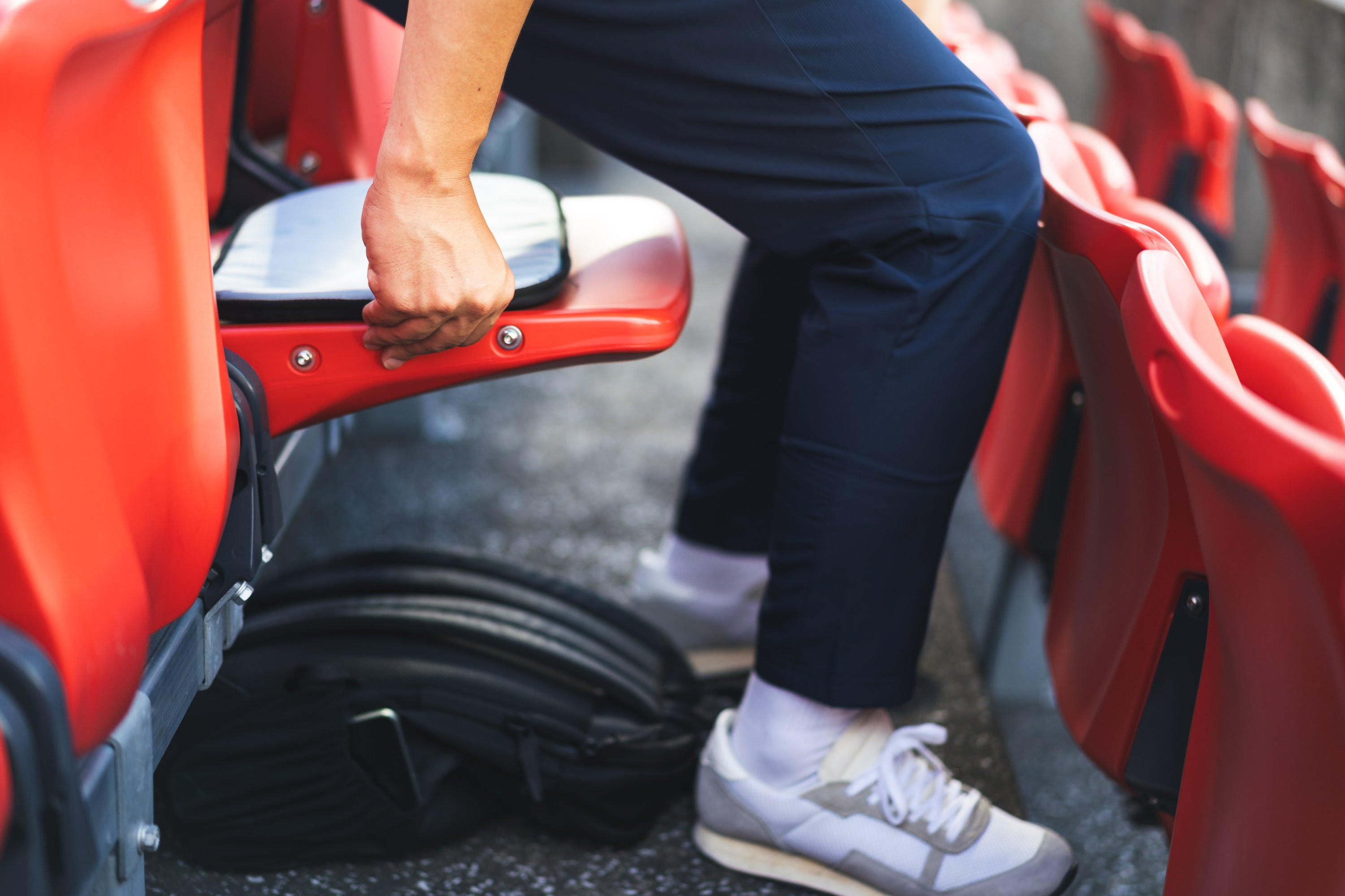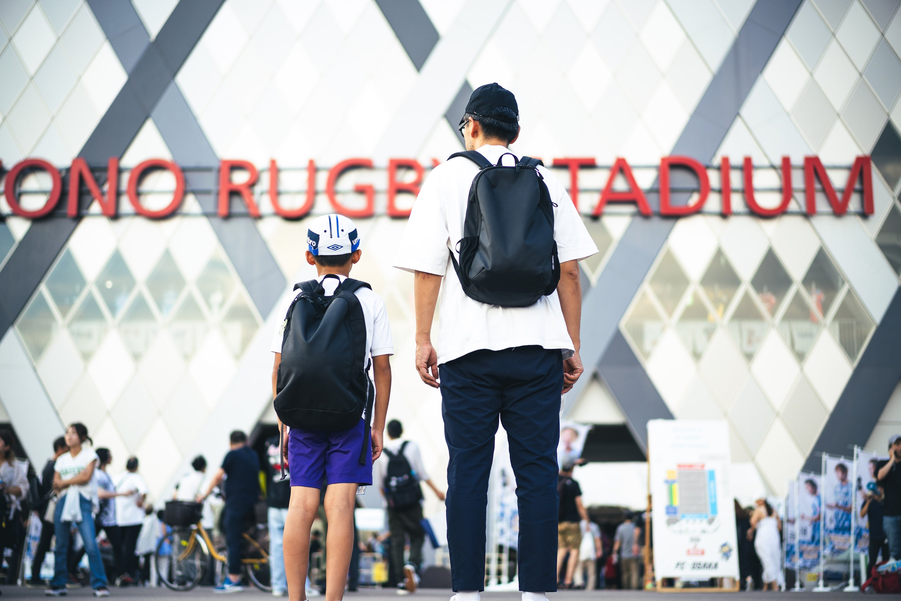 サッカー選手と開発した、スタジアムでのスポーツ観戦用リュック。取り外し可能なハーネス兼シートクッション、座席の下に収めることのできるサイズ感、そのほかにも応援するために必要な機能を搭載している。