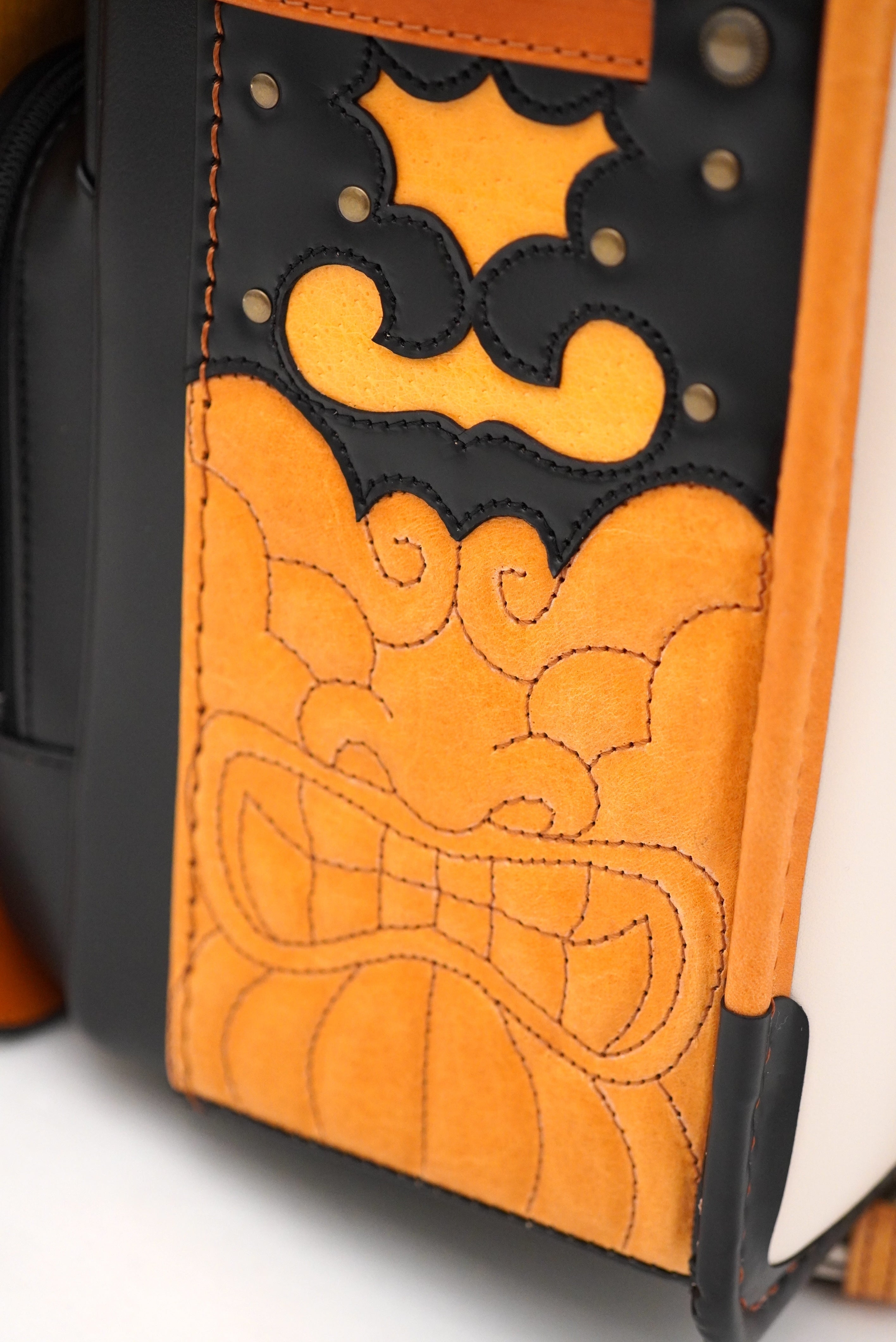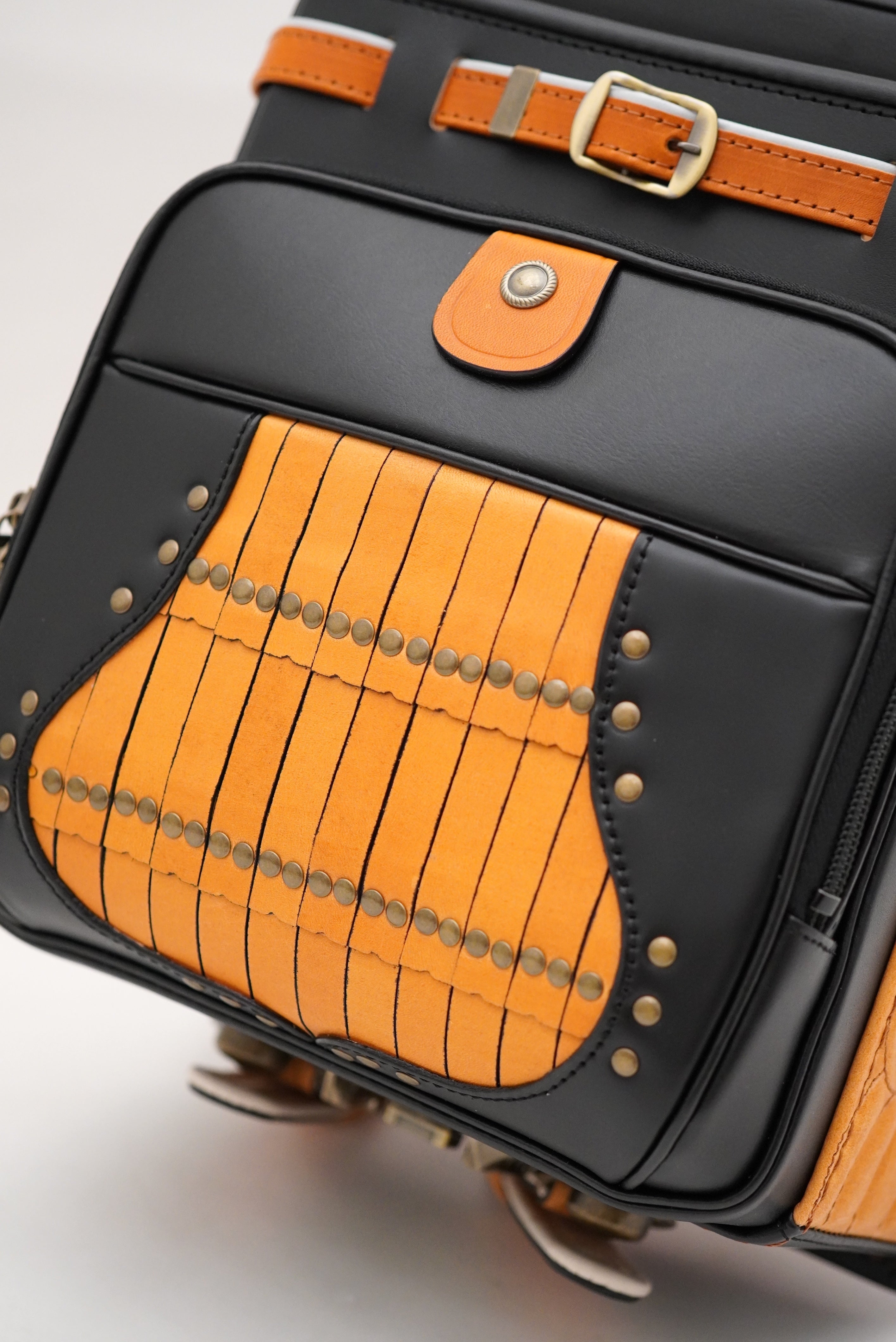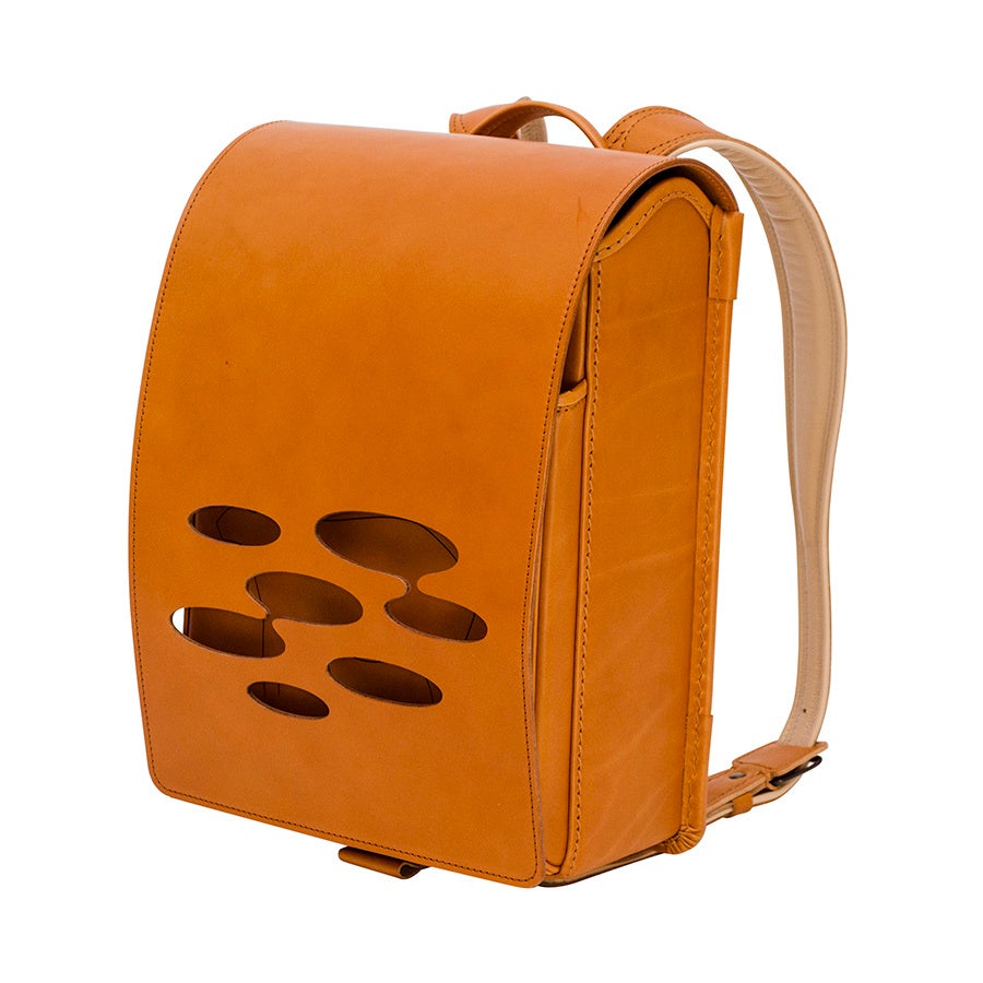 量産時に出る端切れとランドセルのパーツを利用しつつ、本来とは異なるパーツとして使用してみました。作成するにあたり、甲冑にヒントを得て、ランドセルのパーツのみでそれらしく見える形にしました。カブセ部分は引張部分を利用し、1枚ずつ繋ぎ合わせることで甲冑を彷彿とさせるデザインにしており、大マチ部分は異なる革を組み合わせて模様を作り、下部には”睨みを効かせた顔”を左右に作り、より甲冑らしく見えるようにしました。