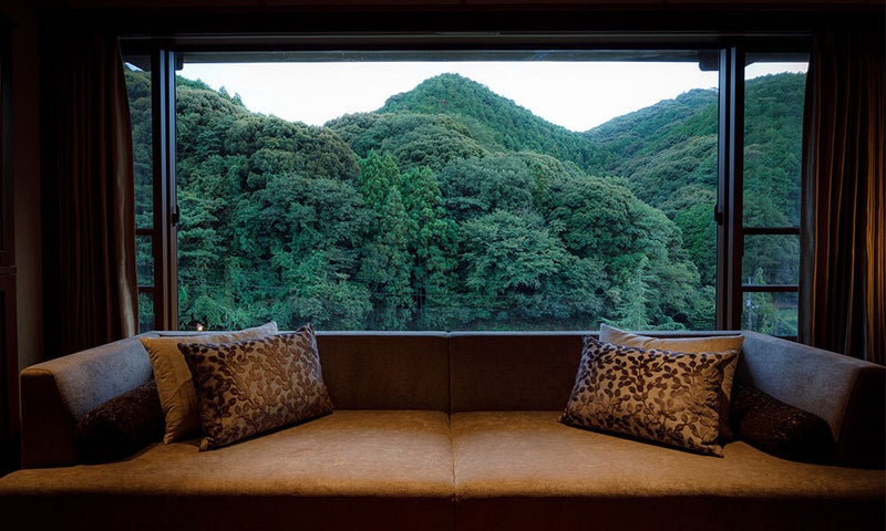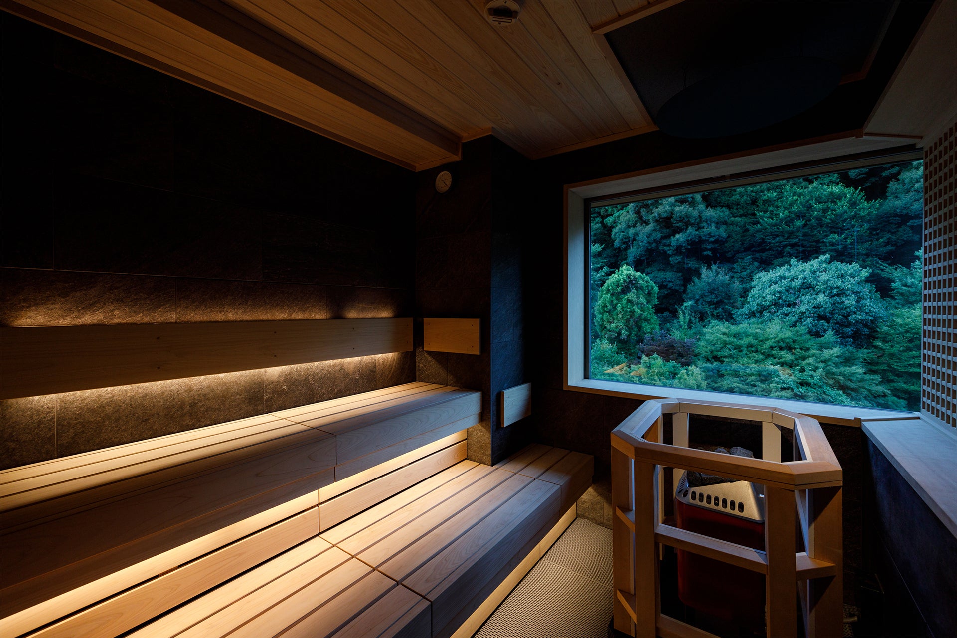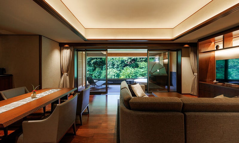 大谷山荘の客室の中で唯一、サウナや水風呂、4ベッドを備えた露天風呂付きスイートルーム。源泉かけ流しのお湯をお愉しみいただくことはもちろん、セルフロウリュウができるサウナや、四季折々の風を感じられるテラスで、心身をリフレッシュしていただけます。リビングスペースには、皆さまでゆったりとご歓談いただけるソファやダイニングテーブルも備えており、連泊でのご利用やご家族でのご旅行にもご対応した設えです。