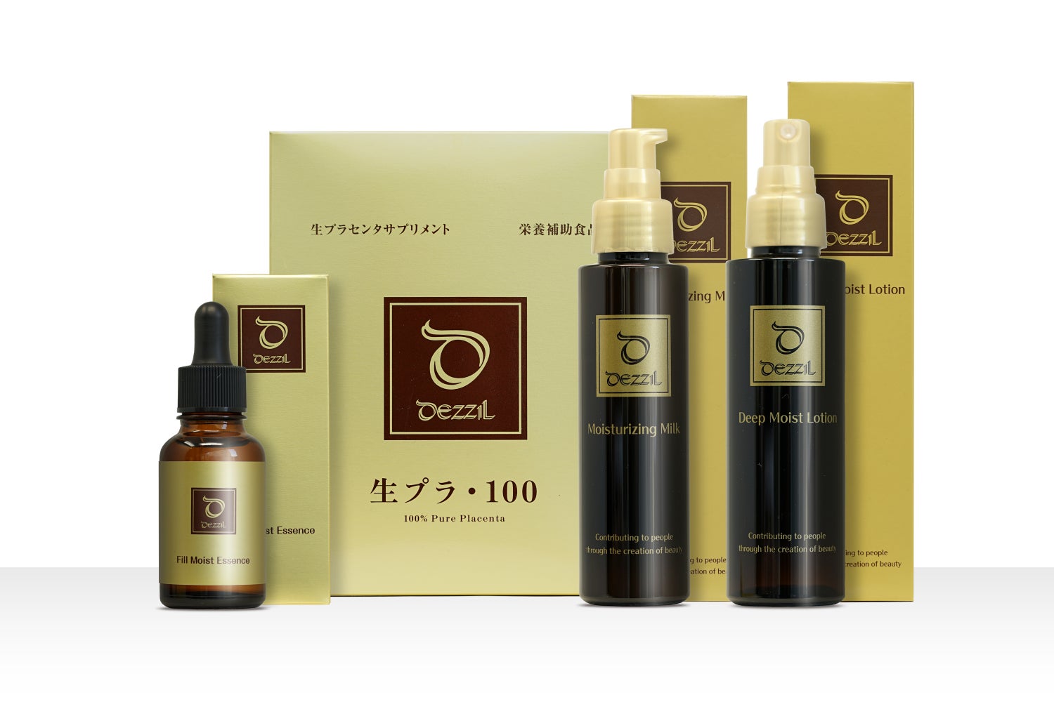 プラセンタ発酵液やナイアシンアミドなどの成分を軸にしたDEZZILシリーズ。モイスチャライジングミルクはさらにヒト幹細胞培養液・エクソソーム・NMNが加わった高保湿エイジングケア乳液。