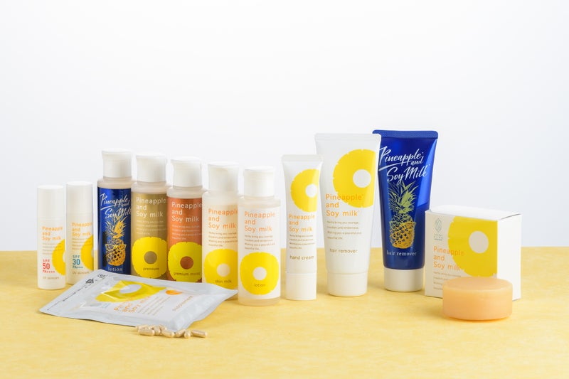 当社で研究開発し販売している、ムダ毛ケア*¹をしながら美肌に導く≪パイナップル豆乳シリーズ≫は幅広い層に支持されています。中でも2004年に生まれた「パイナップル豆乳ローション」は、“塗るだけのムダ毛ケア*¹”として18年以上のロングセラー化粧水です。