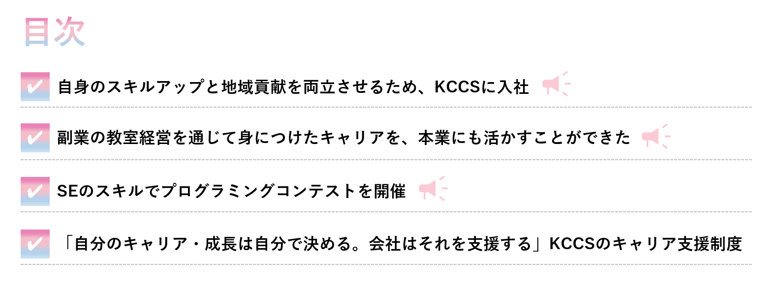 KCCSは「自分のキャリア・成長は自分で決める。会社はそれを支援する」という方針のもと、従業員が多様なキャリア経験や人生経験などを活かしながらキャリアを築くことができるよう、さまざまなキャリア支援制度を導入し、従業員の自己実現を支援しています。