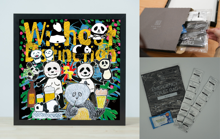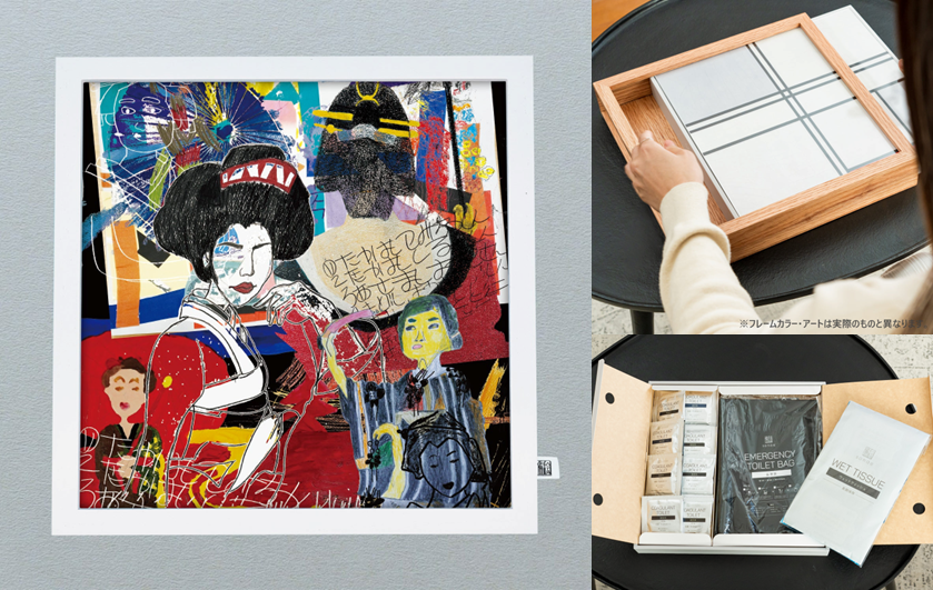 絵画の枠には、いざというときに活用できる「防災トイレキット」30回分をスリムに収納。