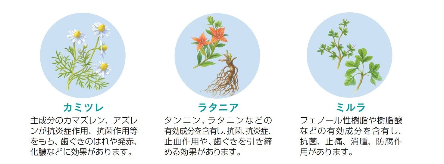 「アセスE」は、3種類の天然ハーブに加え、血行を促進し、歯ぐきの新陳代謝を高めて歯周組織の回復を助けるビタミンEを配合しています。