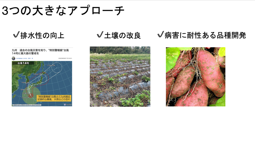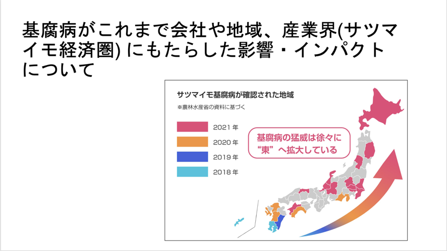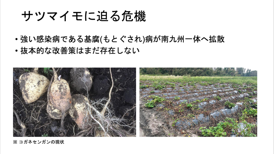 このプロジェクトは、さまざまな角度からサツマイモ基腐病に対する現状を発信することで、サツマイモ基腐病からサツマイモを守り、ひいてはサツマイモ産業を守る一助になることを期待して立ち上げました。サツマイモ基腐病に対する情報を共有し、サツマイモに関わるすべての人がつながることで、サツマイモ産業の発展にも寄与したいと考えております。