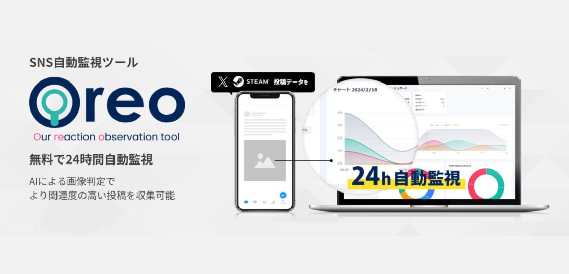 ゲーム業界を中心に品質管理事業を行っているAIQVE ONE株式会社が開発した「Oreo」は、市場の不具合検出に特化したSNS自動監視ツールです。無料で24時間リアルタイムでの自動監視が可能であり、AIによる画像判定でより関連度の高い投稿を抽出します。