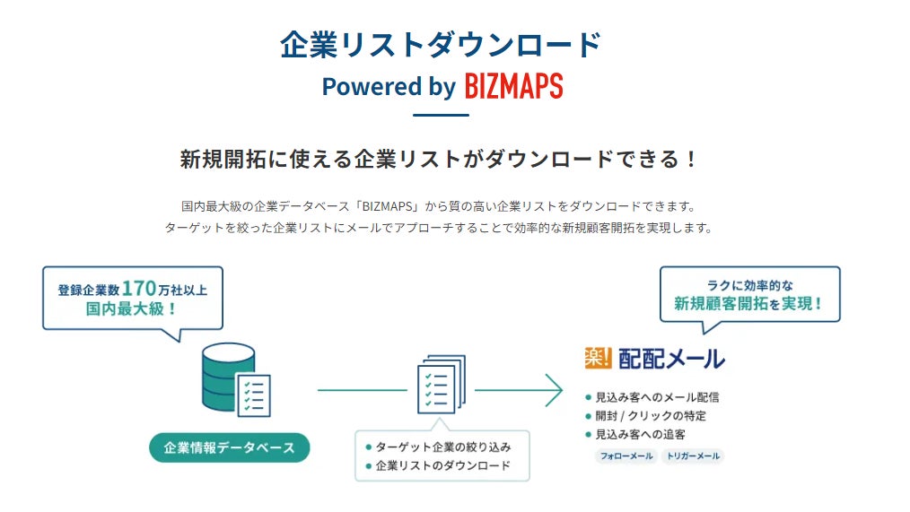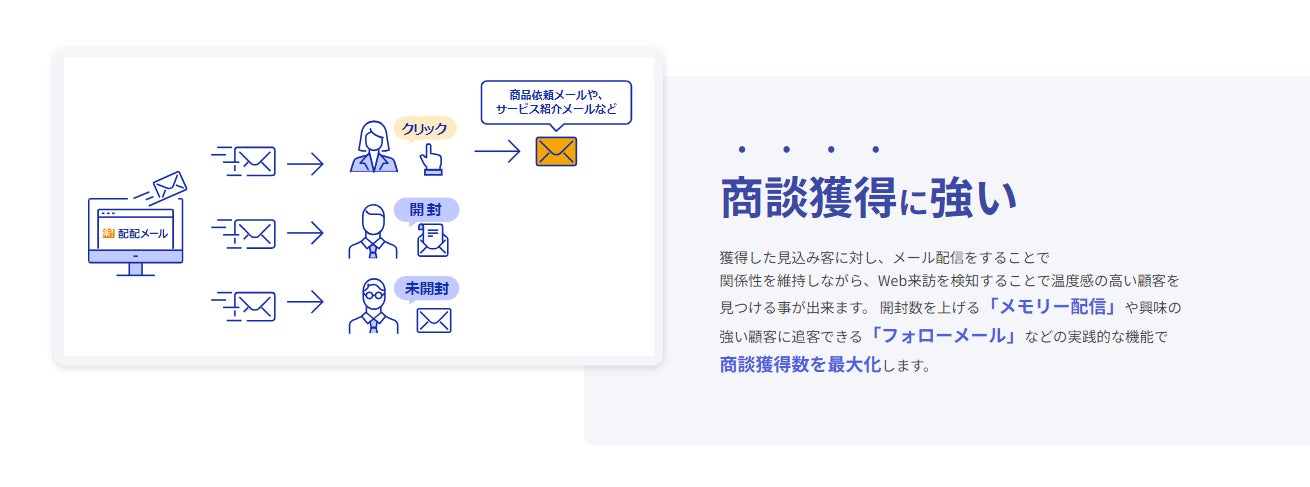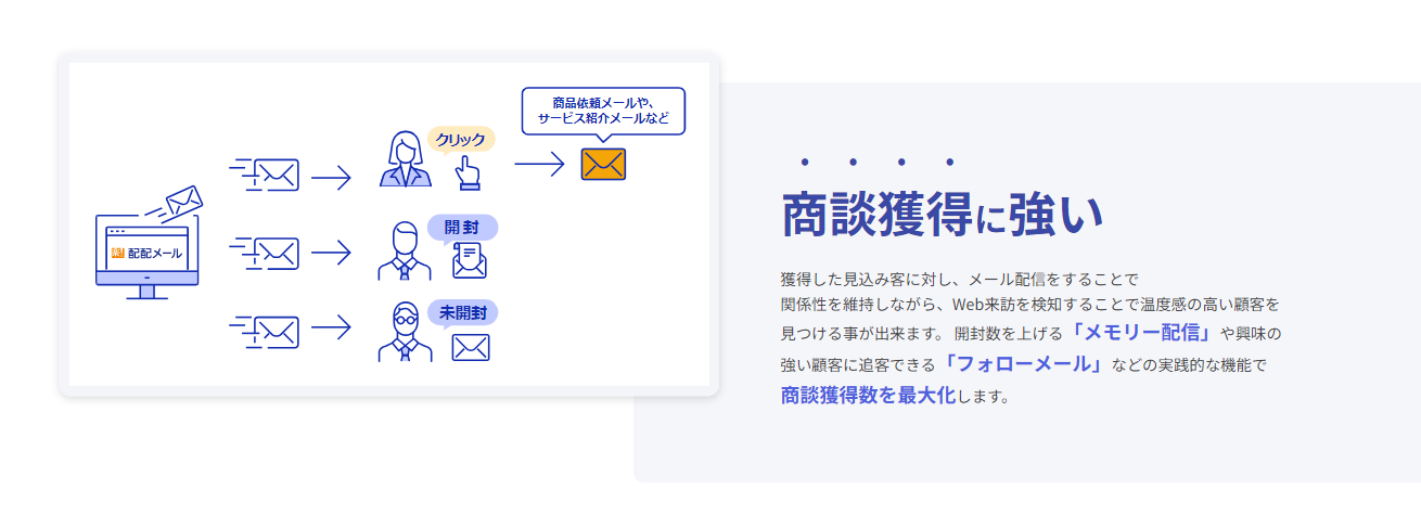 「配配メールBridge」は、だれでも新規顧客開拓ができるMAプランです。商談獲得に特化した機能や、シンプルな設定画面に加え、専任担当による無償の導入活用支援により、はじめての方でもかんたんに新規顧客開拓活動にお取り組みいただけます。