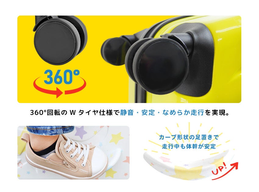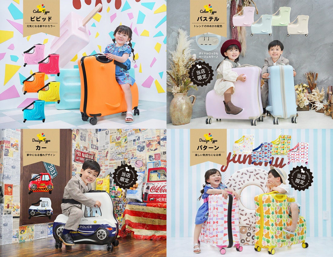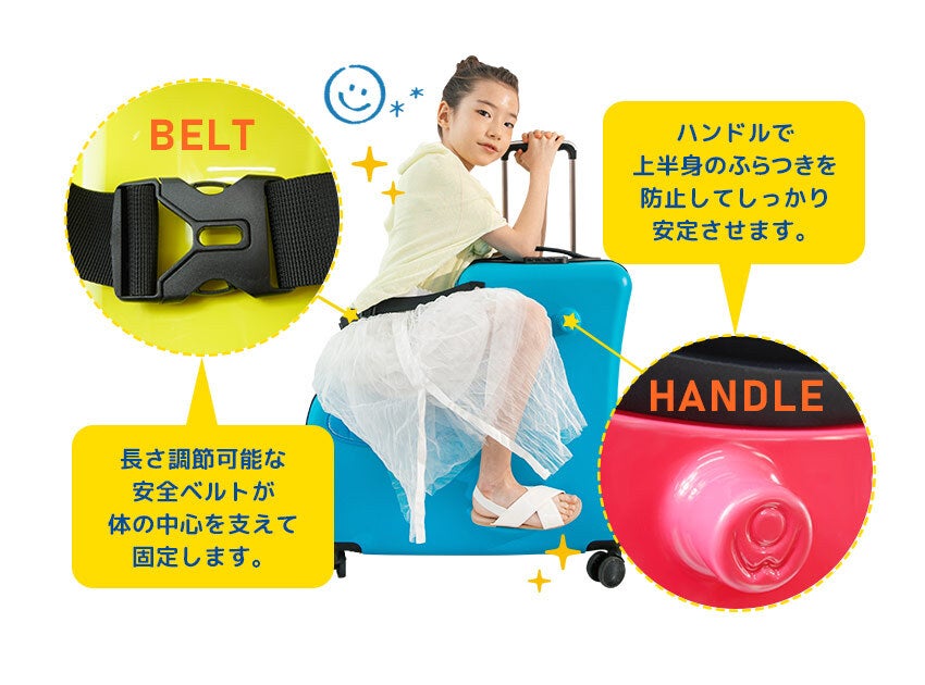 L字型の形状に安全ベルト、足置き、ハンドルなどがついており、子どもを乗せたままスムーズに移動ができるキャリーケース。2019年から発売を開始し、2023年5月にはシリーズ累計45000台を突破した。