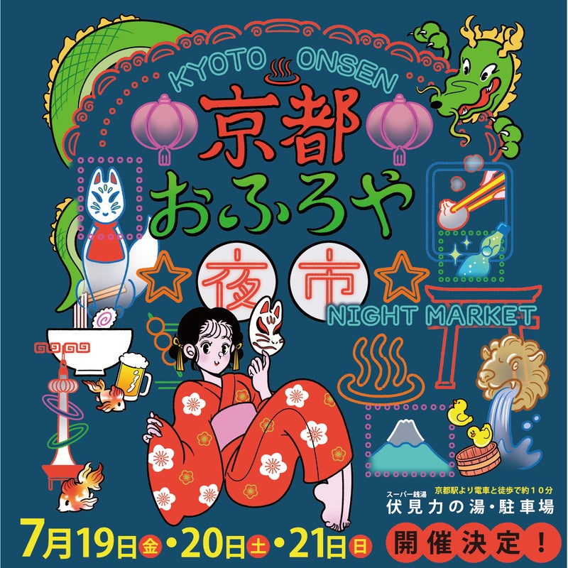 京都のスーパー銭湯「伏見力の湯」のいつもは何もない駐車場に台湾夜市が2024/7/19~7/21の3日間限定で出現! 銭湯と台湾夜市は、街に溶け込む人々の日常に欠かせない存在です。当日は、台湾で人気の大鶏排や小籠包、かき氷などの台湾グルメをはじめ、台湾の屋台ゲームかわいい台湾雑貨などが大集合!会場デザインはマツコの知らない世界の「台湾夜市の世界」に出演した「流動商店 三文字 昌也氏」が監修!駐車場が台湾の屋台に大変貌!台湾の雑多な雰囲気とおふろや文化の融合したフォトジェニックな空間で台湾グルメをお楽しみください!