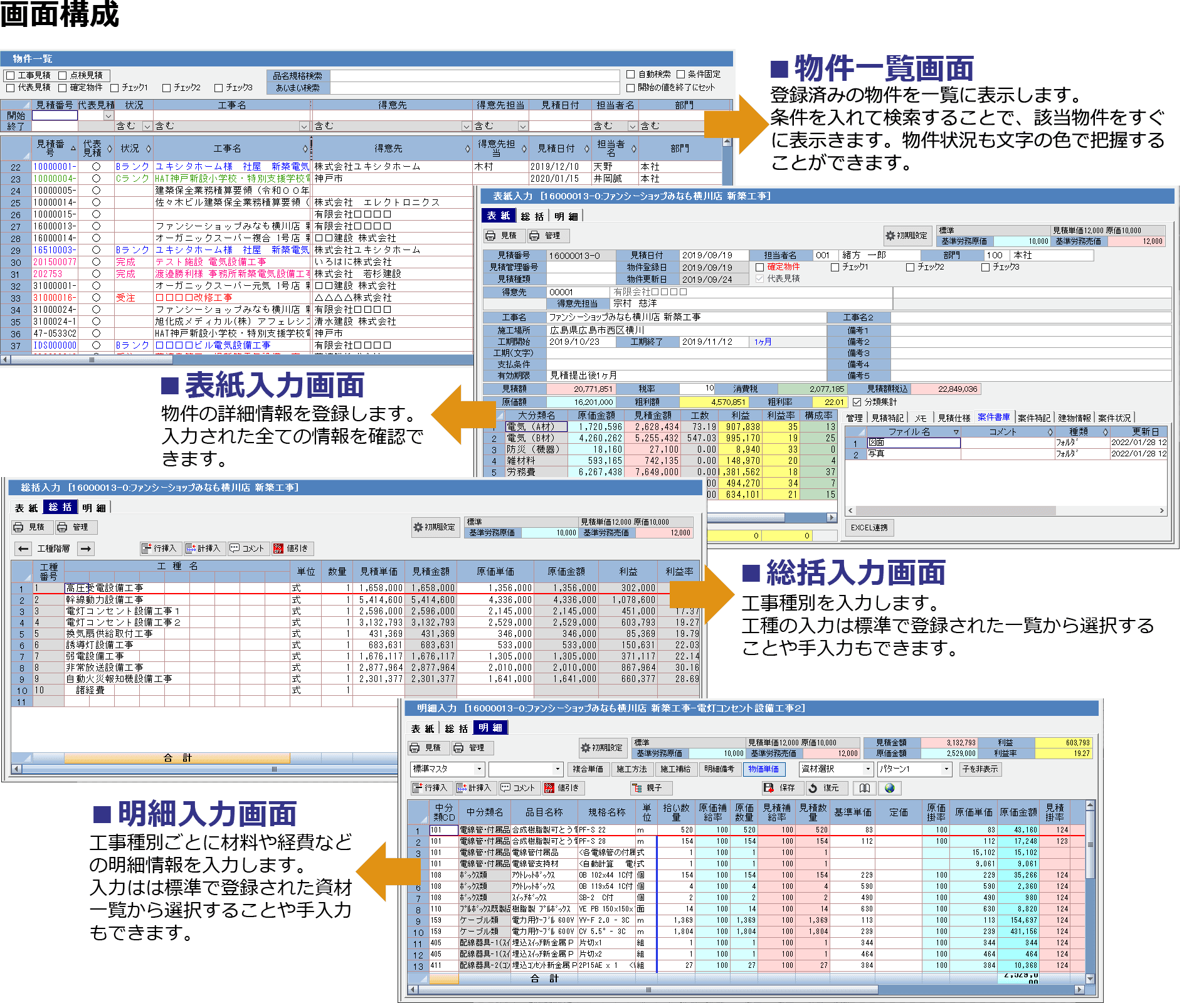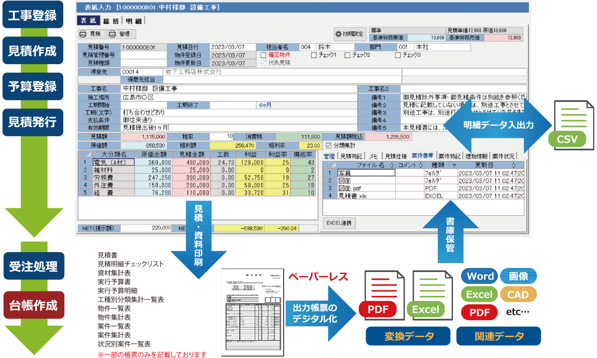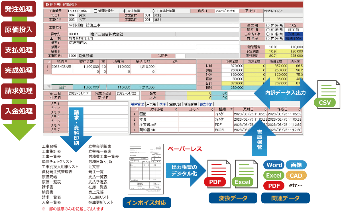工事登録・予算登録・発注処理・仕入登録・在庫管理・支払管理・完成処理