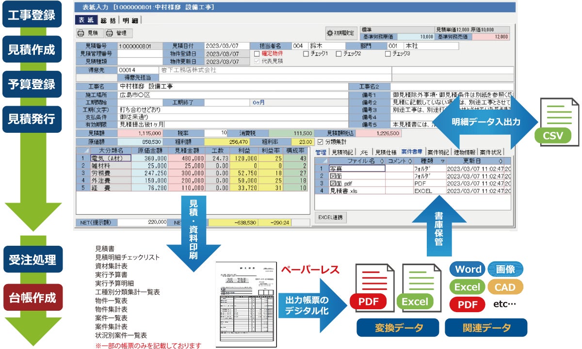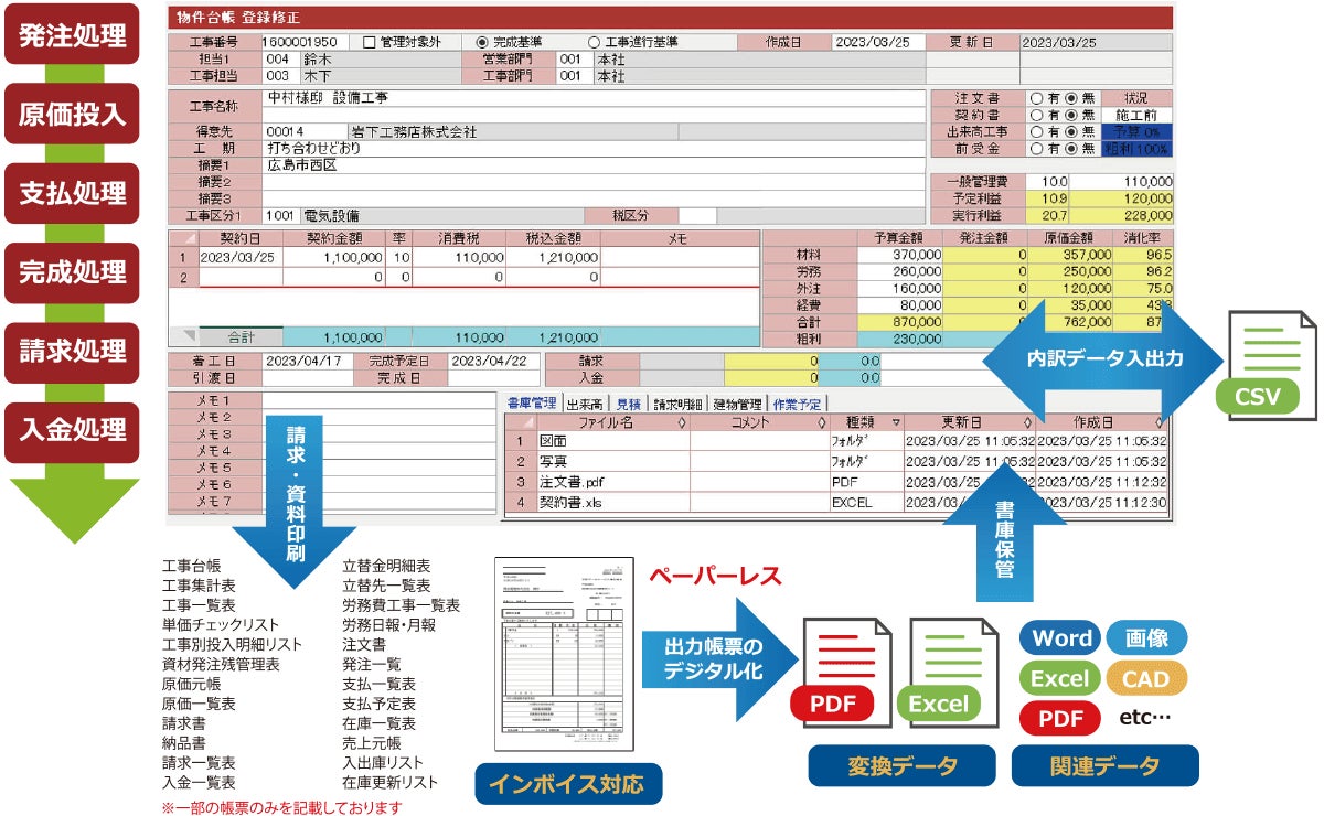 設備業に特化した工事ごとの原価・請求・入金の管理ができる工事原価管理ソフトです。工事の受注から完工までの業務を一元管理できます。EDI、インボイスに対応するオプションもご用意しています。
