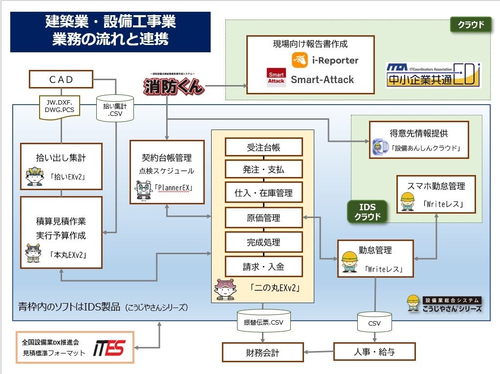 こうじやさんⓇシリーズの各製品はもちろん、CAD、公共積算、施工管理、消防点検、財務会計などの他社製品とも連携しています。中小企業庁が推進する「中小企業共通EDI対応サービス」認証を取得しました。