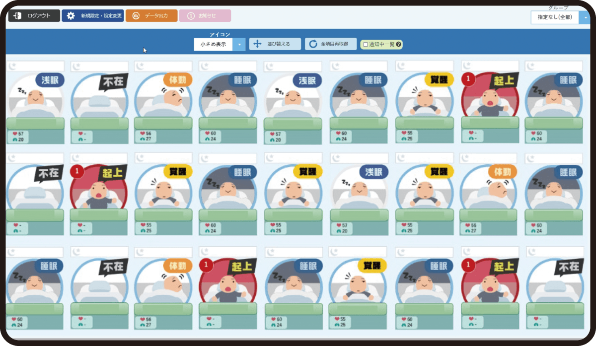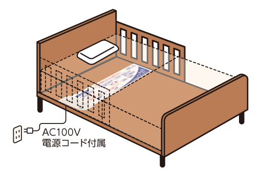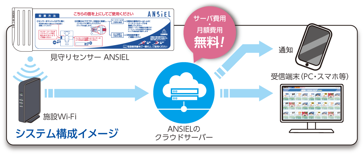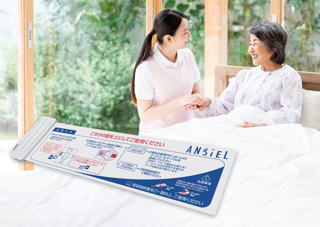ベッドのマットレス下に設置することで、ベッド上の要介護者の動きを検知・解析し、介護士のスマートフォン、パソコンなどの端末に通知する介護支援用品。