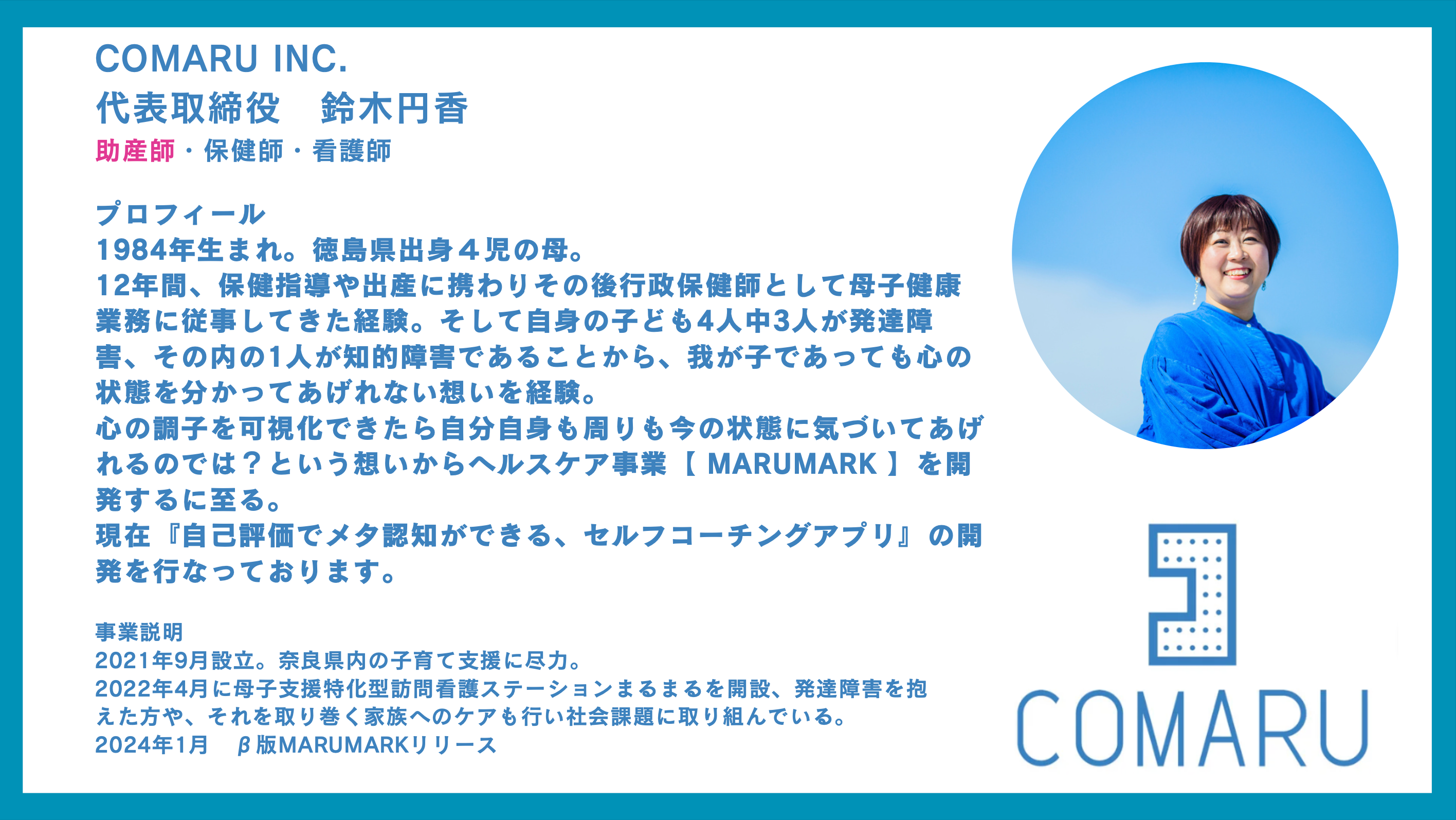 1984年生まれ。徳島県出身4児の母。徳島大学を卒業後、奈良県の総合病院へ助産師として就職。その後保健師を経験し、2020年助産院まる眼鏡ママ相談室を開設。母子支援や家族のケアの必要性を感じ、2021年株式会社COMARUを設立。奈良県内の子育て支援に尽力。2022年に周産期特化型の訪問看護ステーションまるまるを開設、発達障害を抱えた方や、それを取り巻く家族へのケアも行い社会課題に取り組んでいる。自分の子どもであっても考えを分かってあげられなかった経験から、心の変化を可視化できたら自分自身も周りも今の状態に気づいてあげれるのでは?という想いから『Marumark』を開発。特性があってもなくても全ての人が生きやすい世界、本当の意味で支えあうインクルーシブな世界を目指す。