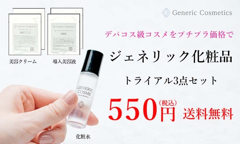 ジェネリック化粧品スキンケアをお手軽にお試しいただける導入美容液、化粧水、美容クリームのトライアルセットです。