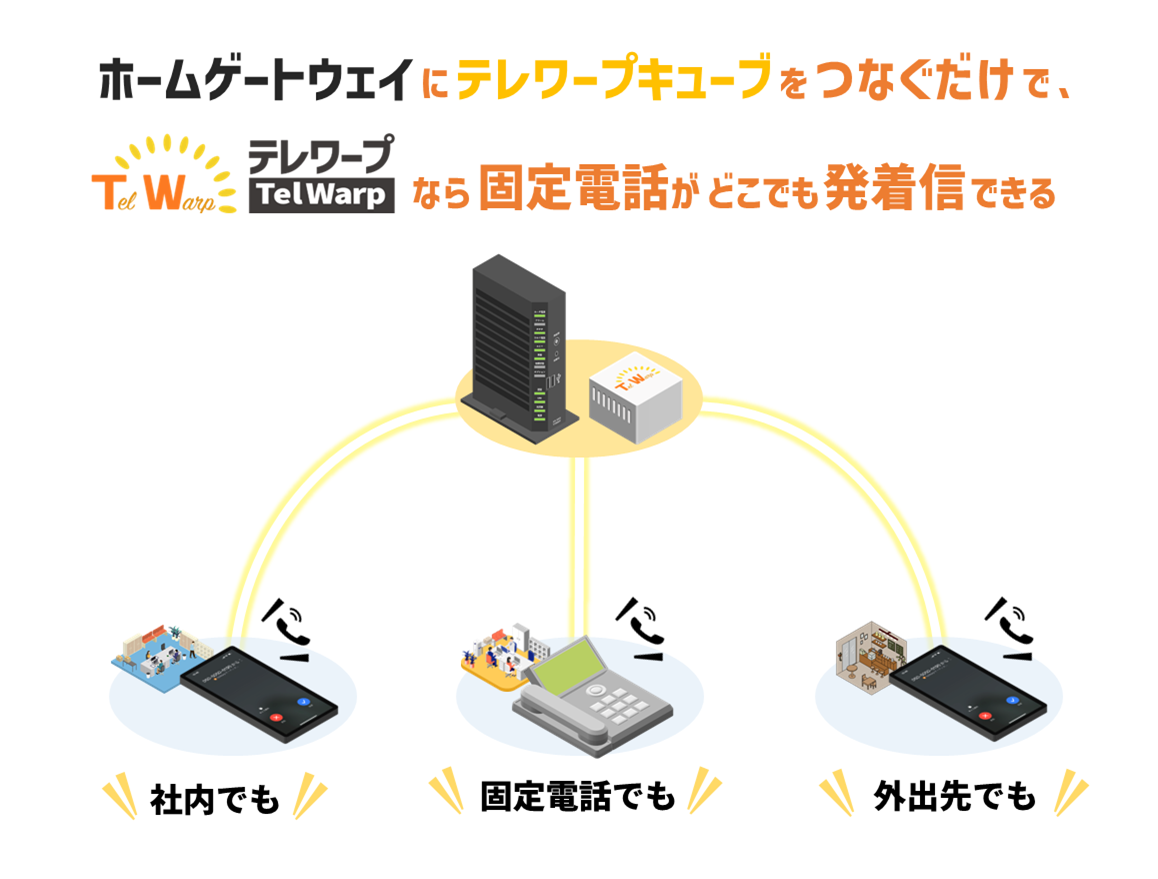 導入も非常に手軽で、「ひかり電話」契約時にNTTより付帯される「ホームゲートウェイ」に専用装置「テレワープキューブ」を接続し、あとはスマートフォンに専用アプリをインストールだけ。たったの2ステップで導入可能です。