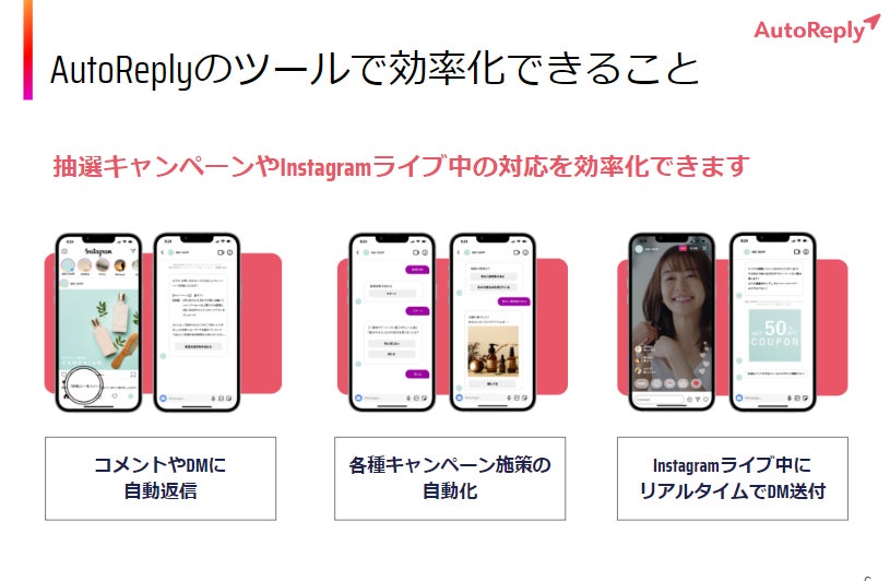 コメントやDMに自動返信したり、抽選キャンペーンなどの各種キャンペーンを自動化して大幅に工数を削減できたり、インスタライブ配信中に自動でDMを送ったりと様々なユーザーコミュニケーションが自動化できます。