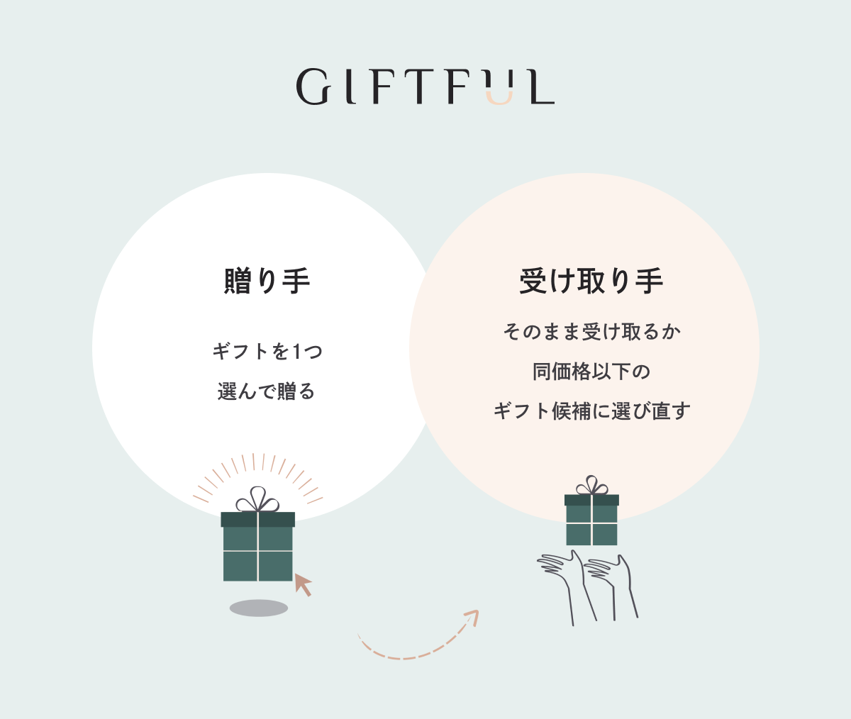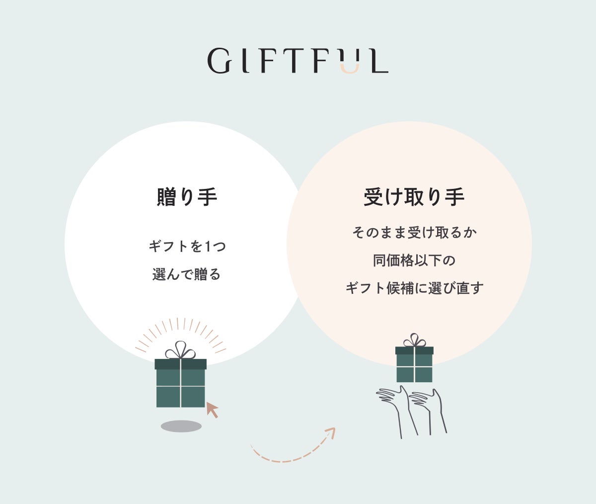 GIFTFULは贈り手がギフトを1つ選んで贈り、受け取り手はそのまま受け取る、あるいはもらって嬉しいギフトに選び直すことができる新しいソーシャルギフトサービスです。