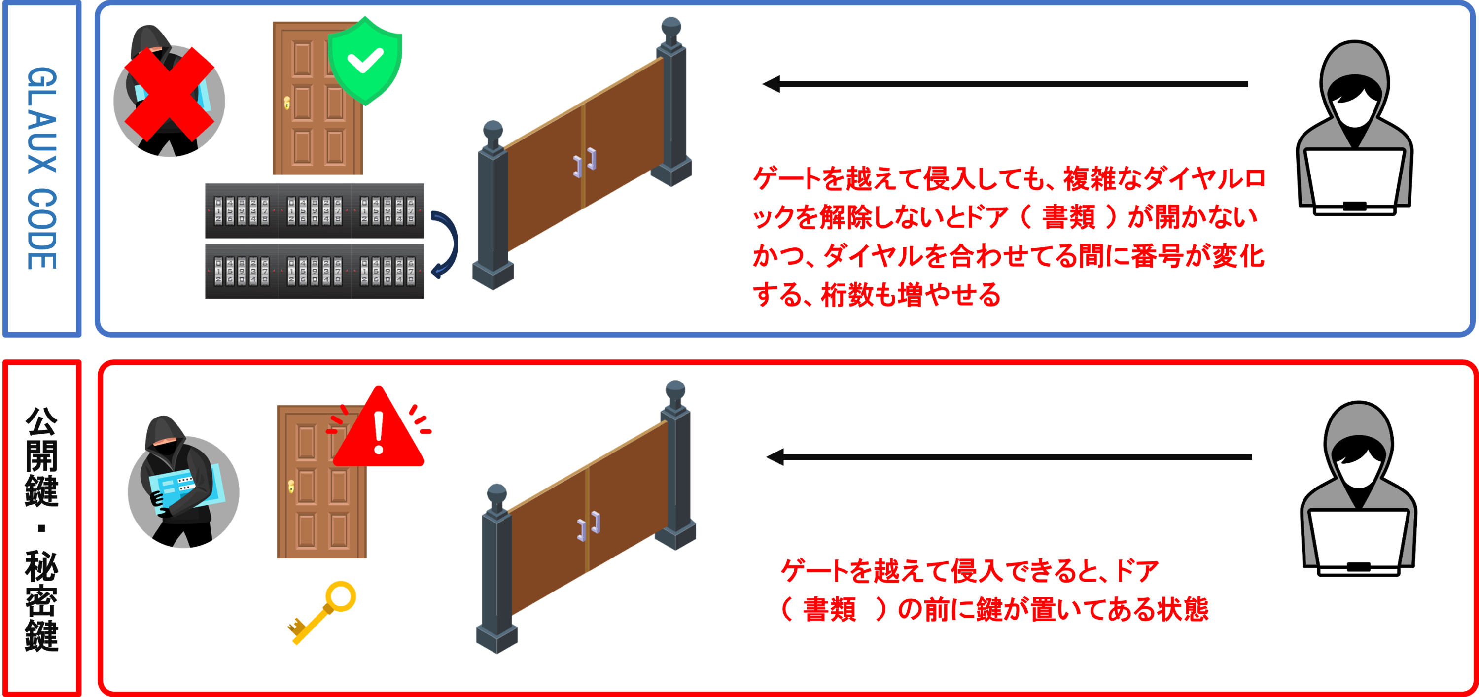 「GLAUX・CODE」では、現在、世界中の通信システムで使用されている秘密鍵をなくし、代わりに秘密鍵の代わりとなるキーワードのみを残すことにしました。残された”キーワード”から秘密鍵を算出するのは非常に困難となるため、相当程度ハッキング被害を解決することが出来ます。さらに通信毎に”キーワード”を自動的に変更する技術を実装することで、秘密鍵の算出を理論上不可能な領域にまで高めています。また、ハッカーがデータをサーバーから持ち出そうとした場合には、破壊データとなる仕組みも取り入れておりますので、「GLAUX・CODE」は、ハッキング被害の根本解決を目指すために十重二十重に革新的な仕組みを導入したセキュリティエンジンです。