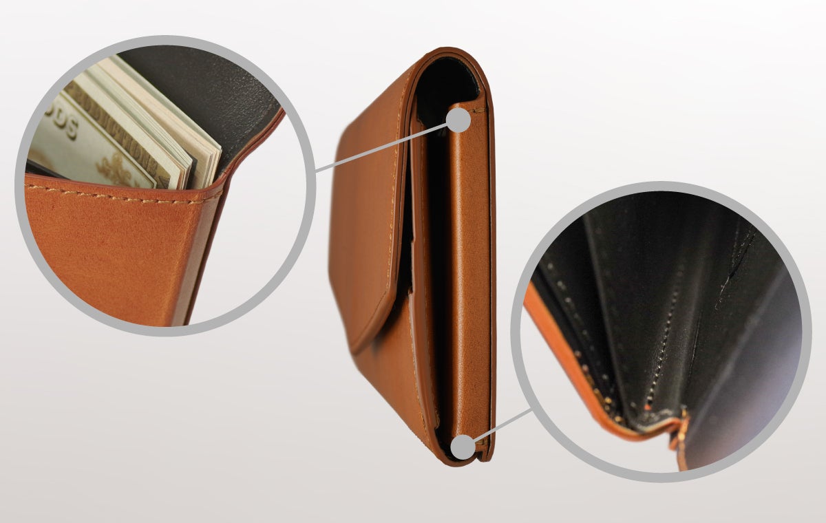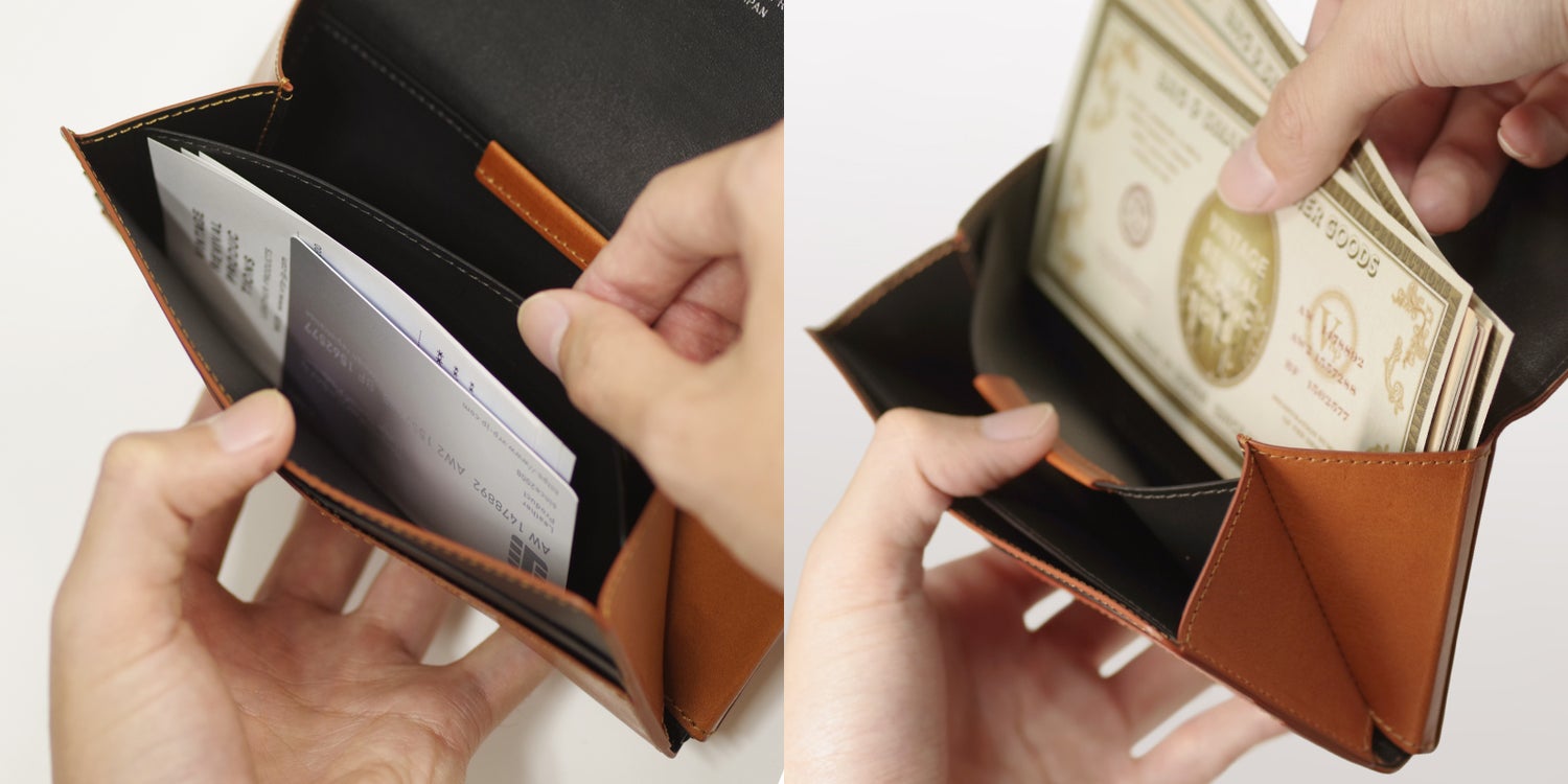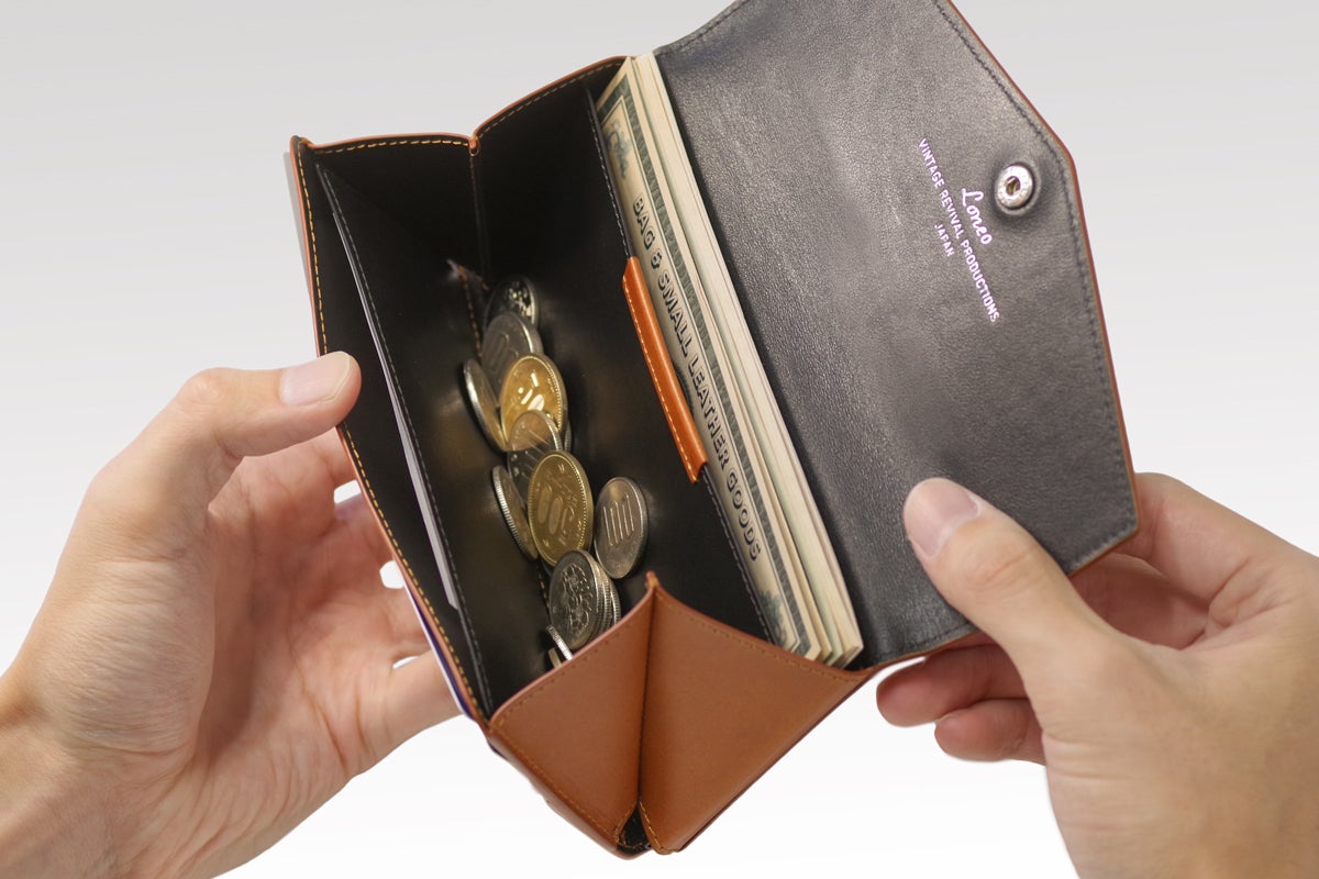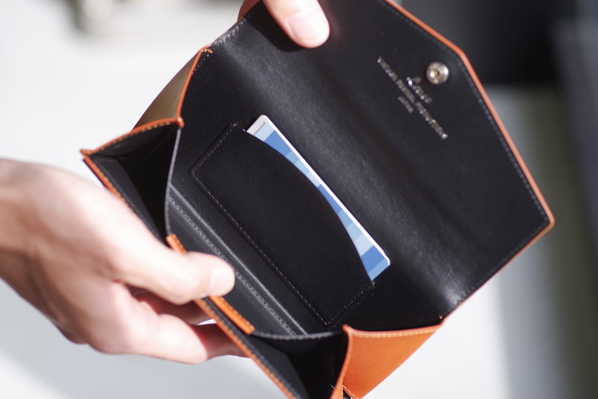 交互に重なりふわっと開くカード段と、一目で財布の中が見渡せる内装デザイン。大きさを理由に長財布を諦めていた方や、ミニ財布に興味はあるけどお札は折りたくない方にもおすすめです。