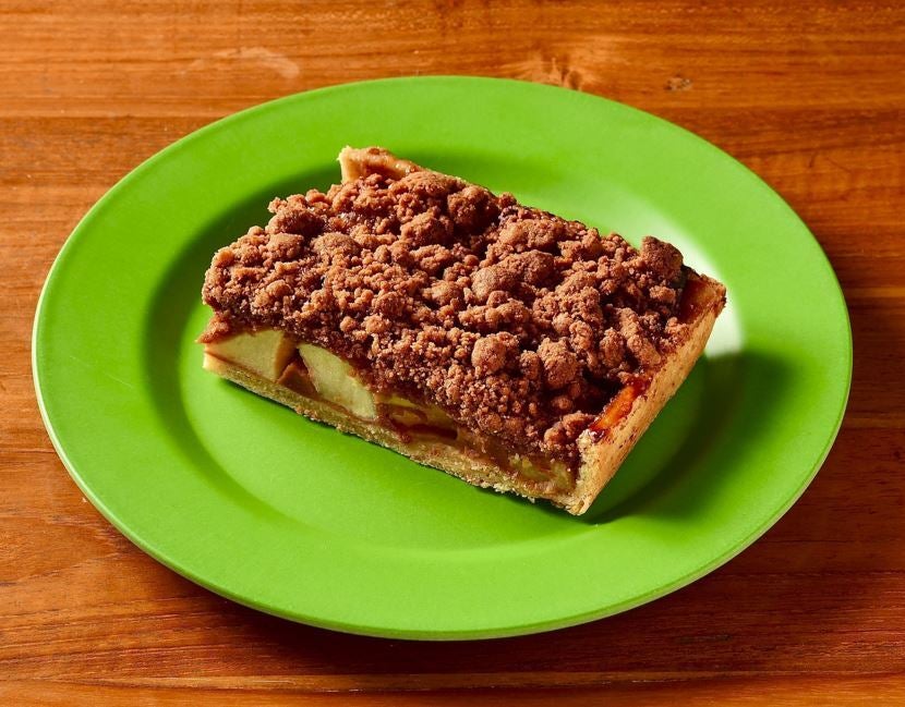 りんごの食感を活かす為に生のまま焼き上げています。ブラウンシュガーを活用し甘すぎないように調整。パイ生地もオリジナルで全粒粉の素朴な味わいにしています。