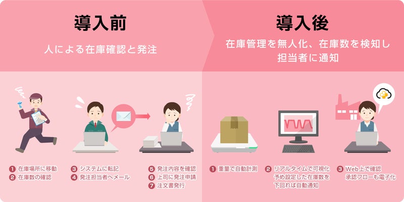 スマートマットクラウド(在庫管理用IoT)で、在庫を重さで計測し、在庫数を見える化、在庫数に応じて発注担当者に自動で連絡し発注漏れを防止します。