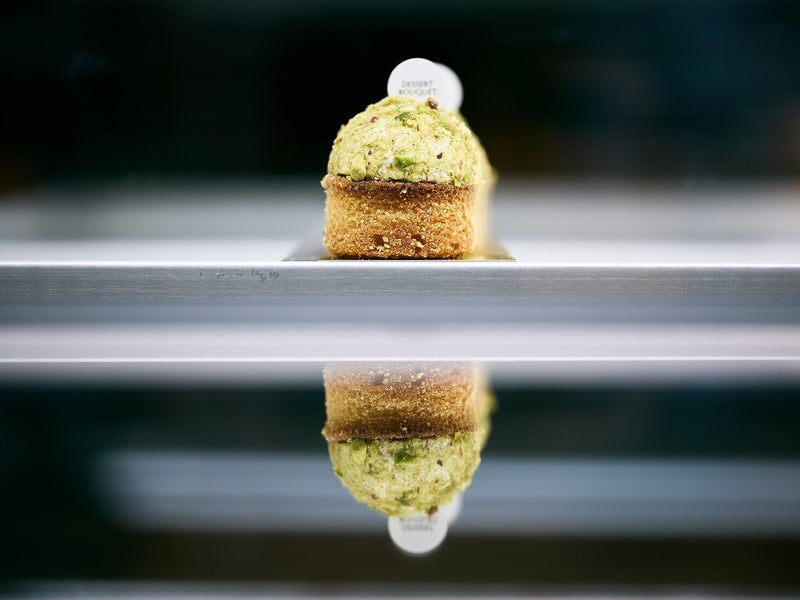 ピスタチオの軽いバタークリームと、グリオットチェリーのホールを入れたアーモンド生地。