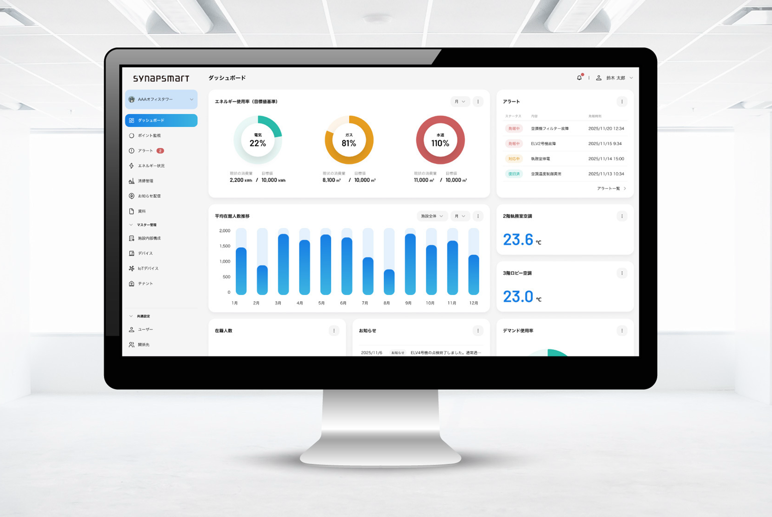 「synapsmart」は、ソフトバンクが持つ ICT(情報通信技術)やデータ基盤に関する技術に加えて、スマートビルの構築支援などを行うグループ会社の SynapSpark が持つ建築設計と都市開発の専門知識やビル設備・運営に関するノウハウを生かして開発した、ビル OS ソリューションです。