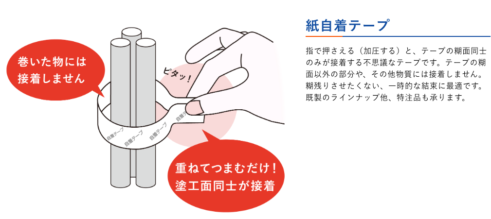 指で押さえる(加圧する)と、テープの糊面同士のみが接着する不思議なテープです。テープの糊面以外の部分や、その他物質には接着しません。