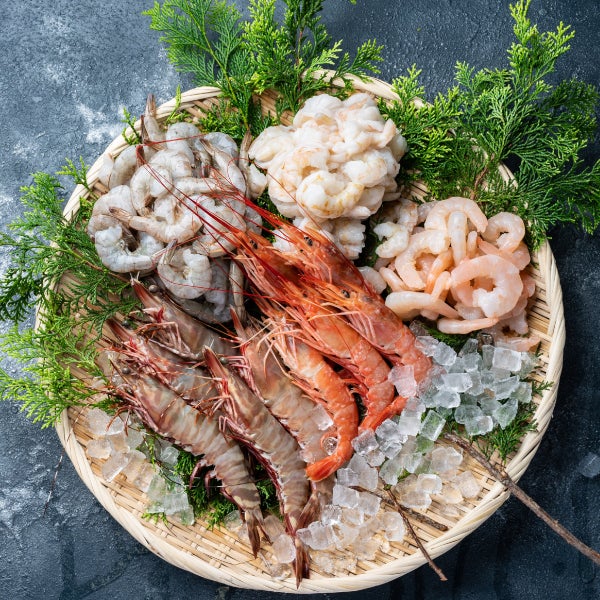 バナメイエビ、天然ブラックタイガー、アルゼンチン赤海老、インドネシアソフトシェルシュリンプ、セネガル産ピンクエビ