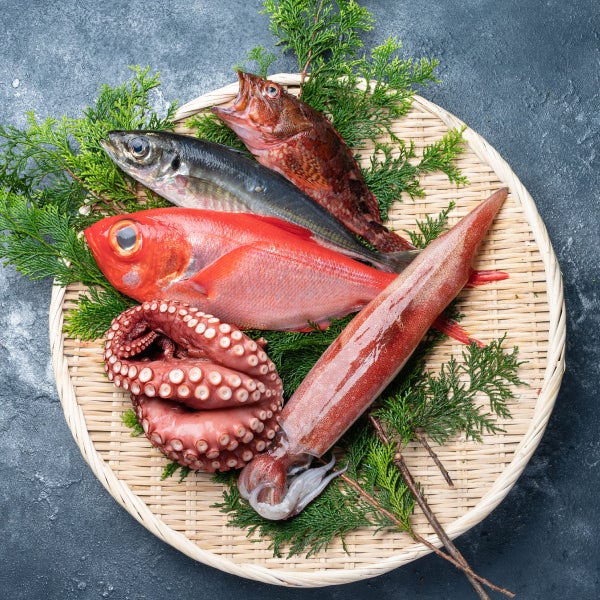ガシラ、キンメダイ、平アジ、剣先イカ、明石のゆでだこ(半身)、