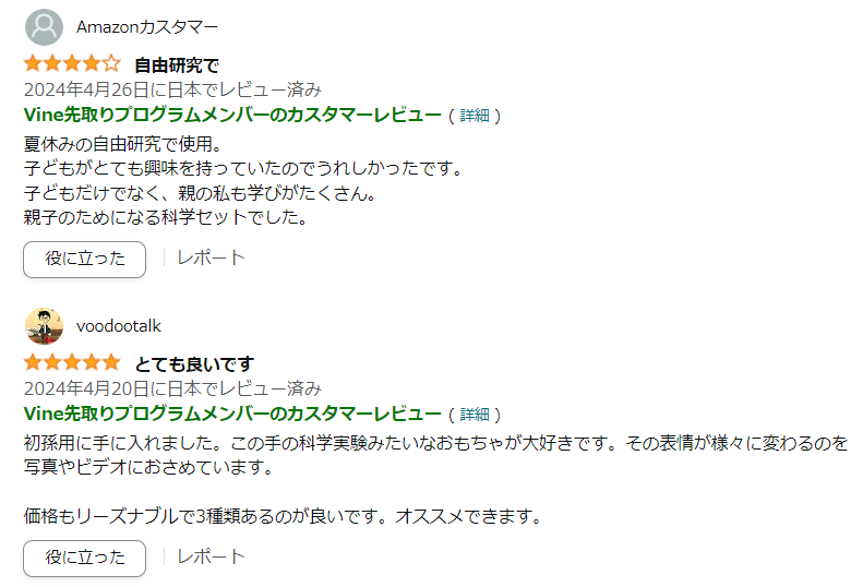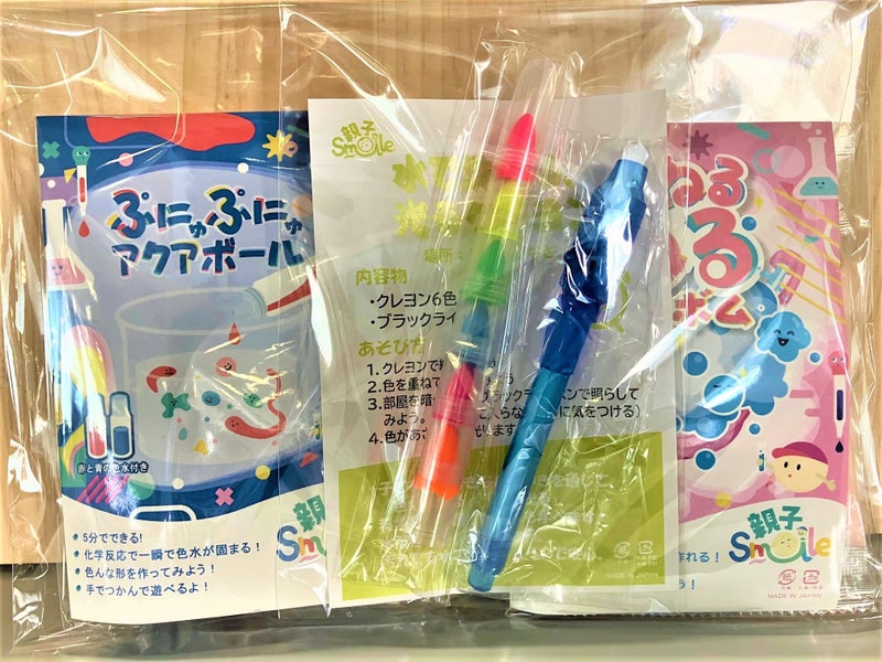【セット内容】水で洗える、光るクレヨン+ぷにゅぷにゅアクアボール+ねるねるねるバスボム!【水で洗える、光るクレヨン】紫外線を当てると蛍光に光る不思議なクレヨンです。 自由に絵を描いた後にブラックライトを当てて、変化を楽しめます。 しかも水で落とせるので、手指や服が汚れても大丈夫! お子さんからの「お絵描きしたよー!見て見てー! 」ではなく、つい親から「見せて見せて!」と言いたくなってしまうようなきれいな発色です。 【ぷにゅぷにゅアクアボール 】市販の実験セットでよく見かける「つかめる水玉」をお湯を使わない時短バージョンにアレンジ。 しかも二色の色つきで楽しさも倍増!! ぷにゅぷにゅしたカラフルな水玉に子ども達はもちろん親も夢中。 どうやったら大きい水玉になるか?ながーい水玉になるか?など色々試してみてくださいね。 【ねるねるねるバスボム】粉にちょっと水を入れて練った後、もう一つの粉を入れてねるねるすると…もこもこ!! 酸とアルカリの反応を学べます。 最後はお風呂に入れてしゅわしゅわ!一度で二度楽しめる手づくりバスボムです。