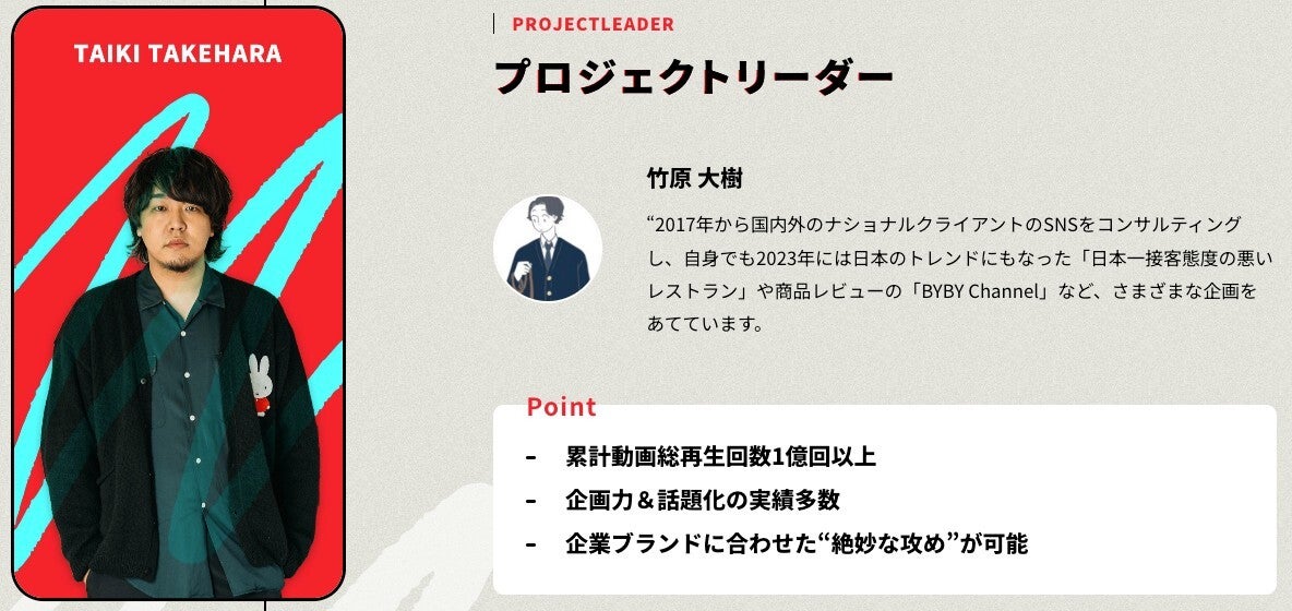 “2017年から国内外のナショナルクライアントのSNSをコンサルティングし、自身でも2023年には日本のトレンドにもなった「日本一接客態度の悪いレストラン」や商品レビューの「BYBY Channel」など、さまざまな企画をあてています。