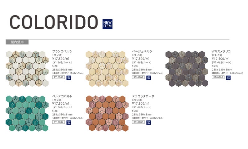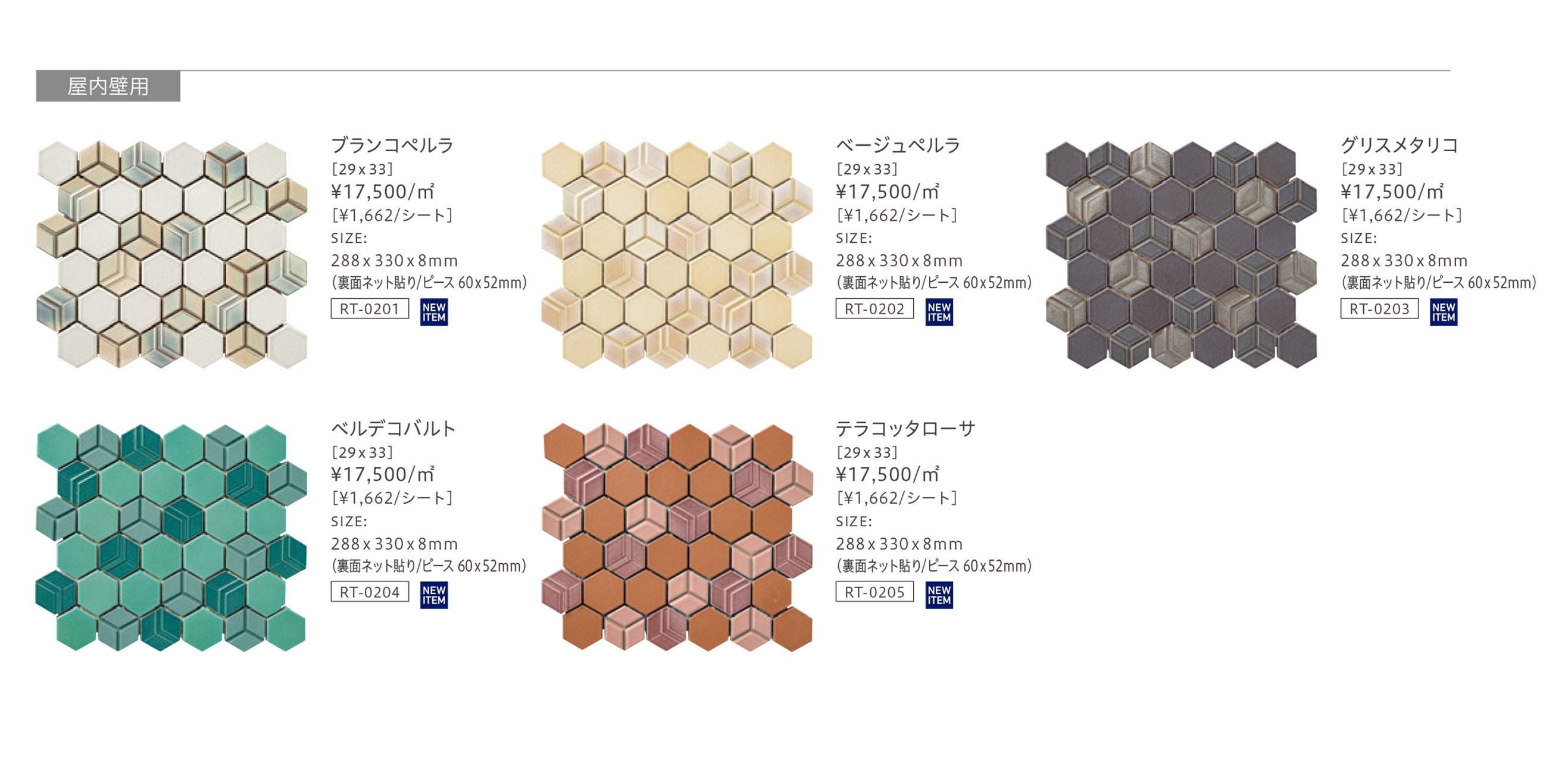 屋内壁用 [29×33]ブランコぺルラ/ベージュペルラ/グリスメタリコ/ベルデコバルト/テラコッタローサ