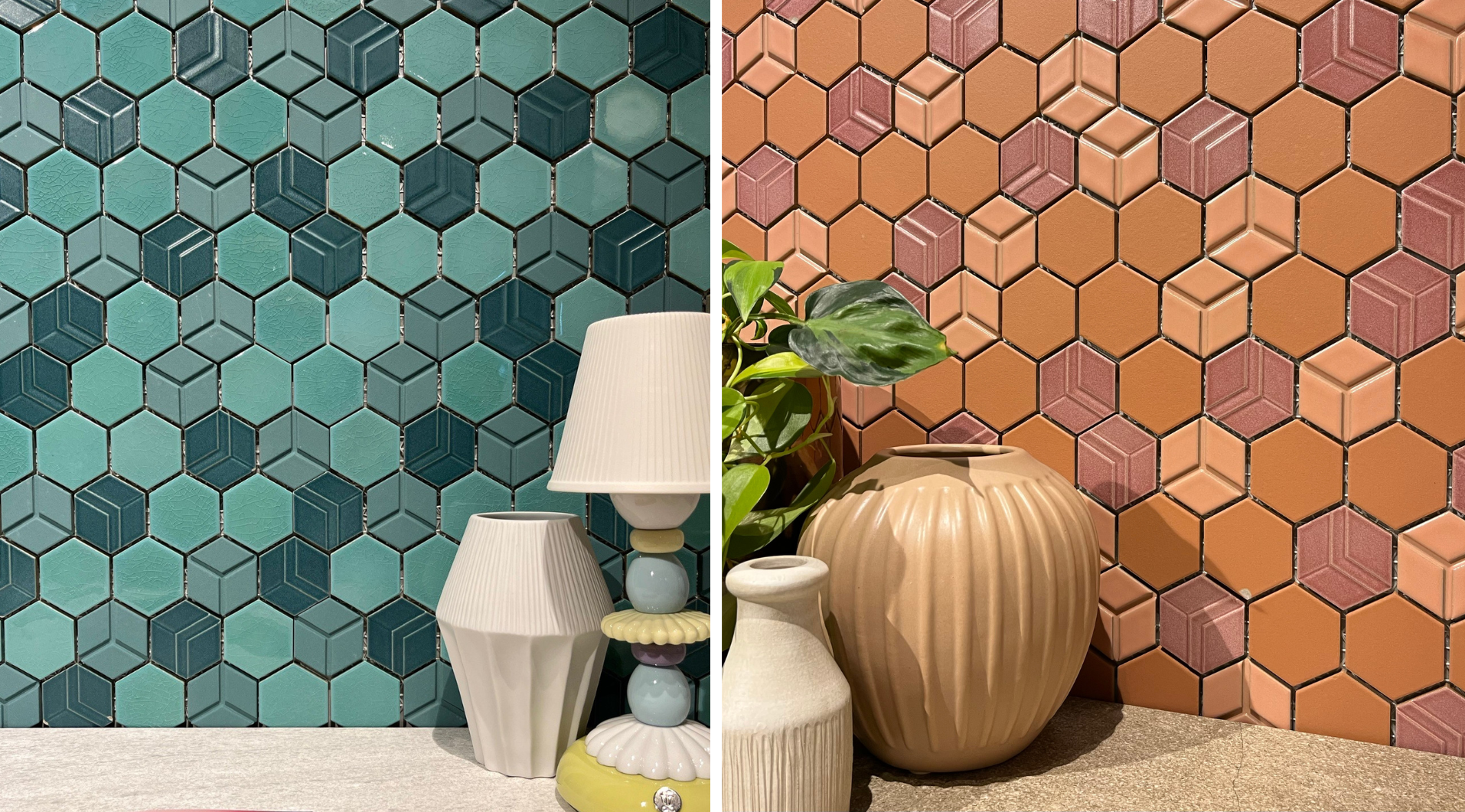 3種類のピースデザインと、色ごとに用いた多彩な釉薬の組み合わせが、六角形タイルに豊かな表情を感じさせます。