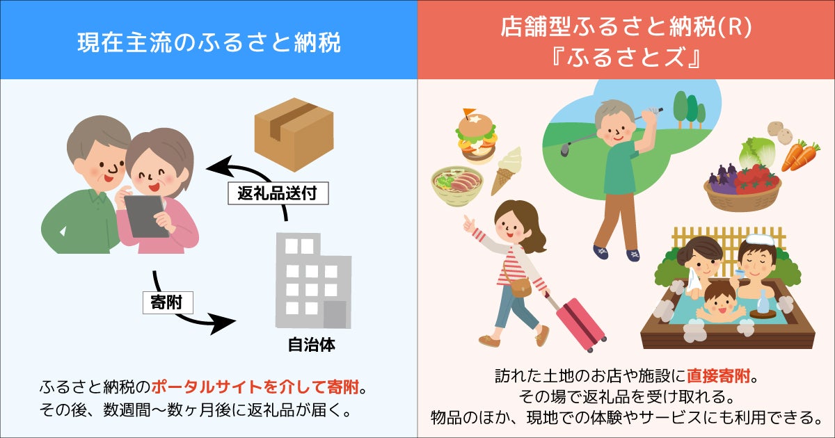 『ふるさとズ』は、訪れた土地の店舗や施設にて、その場で直接寄附を行い、その場ですぐに返礼品を受け取れるサービスです。ネットショップ感覚で返礼品を選ぶのではなく、訪れた現地の魅力を通してモノや体験の返礼品を選んでもらい、寄附に繋げます。よりマチを体感しやすいことが特徴で、現地の魅力を通してマチ・自治体のファンになってほしいと考えています。